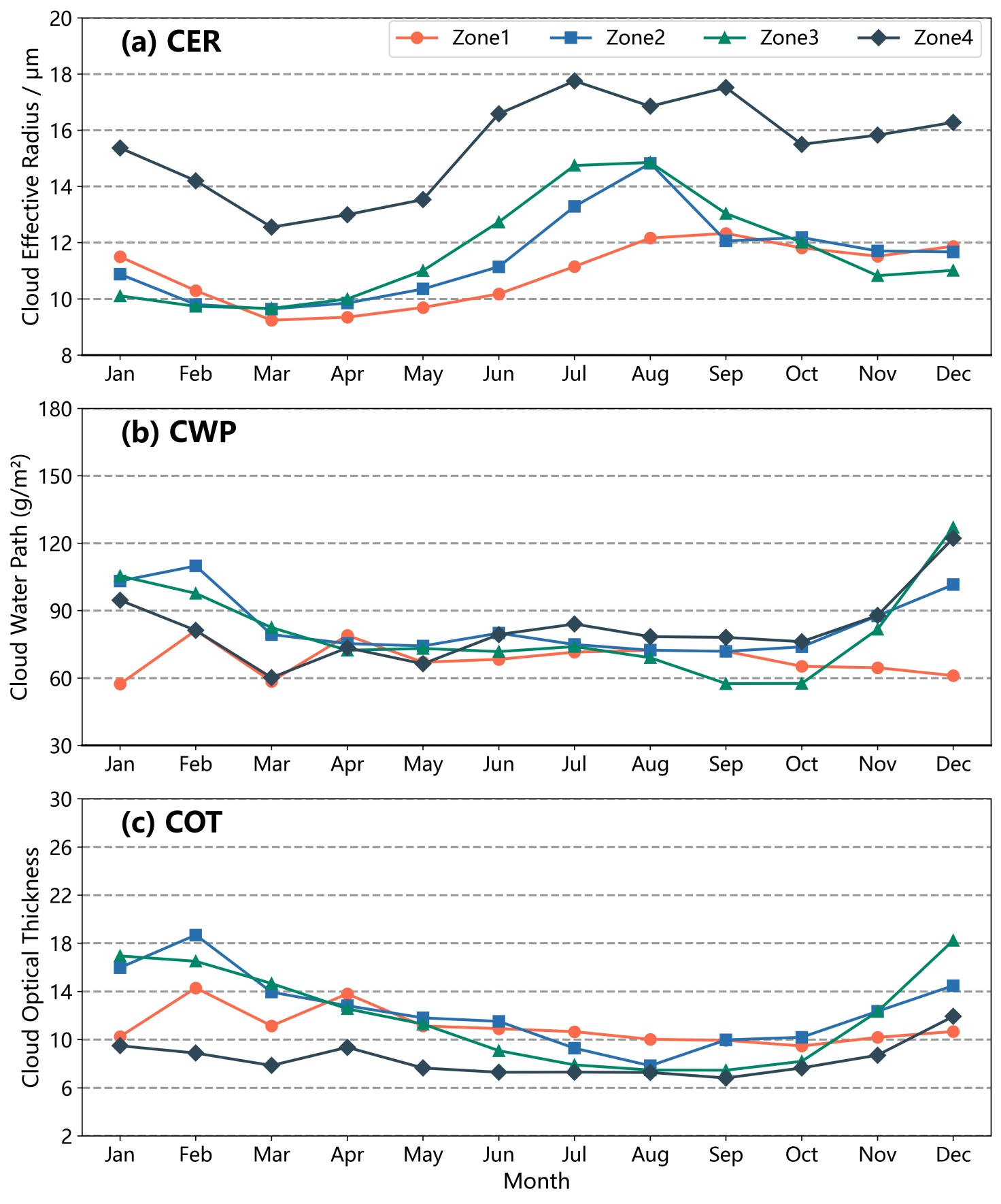 Figure 9. Monthly mean values of cloud physical properties for the subregions of China’s coastal seas. (a) cloud effective particle radius, (b) cloud liquid water path, and (c) cloud optical thickness