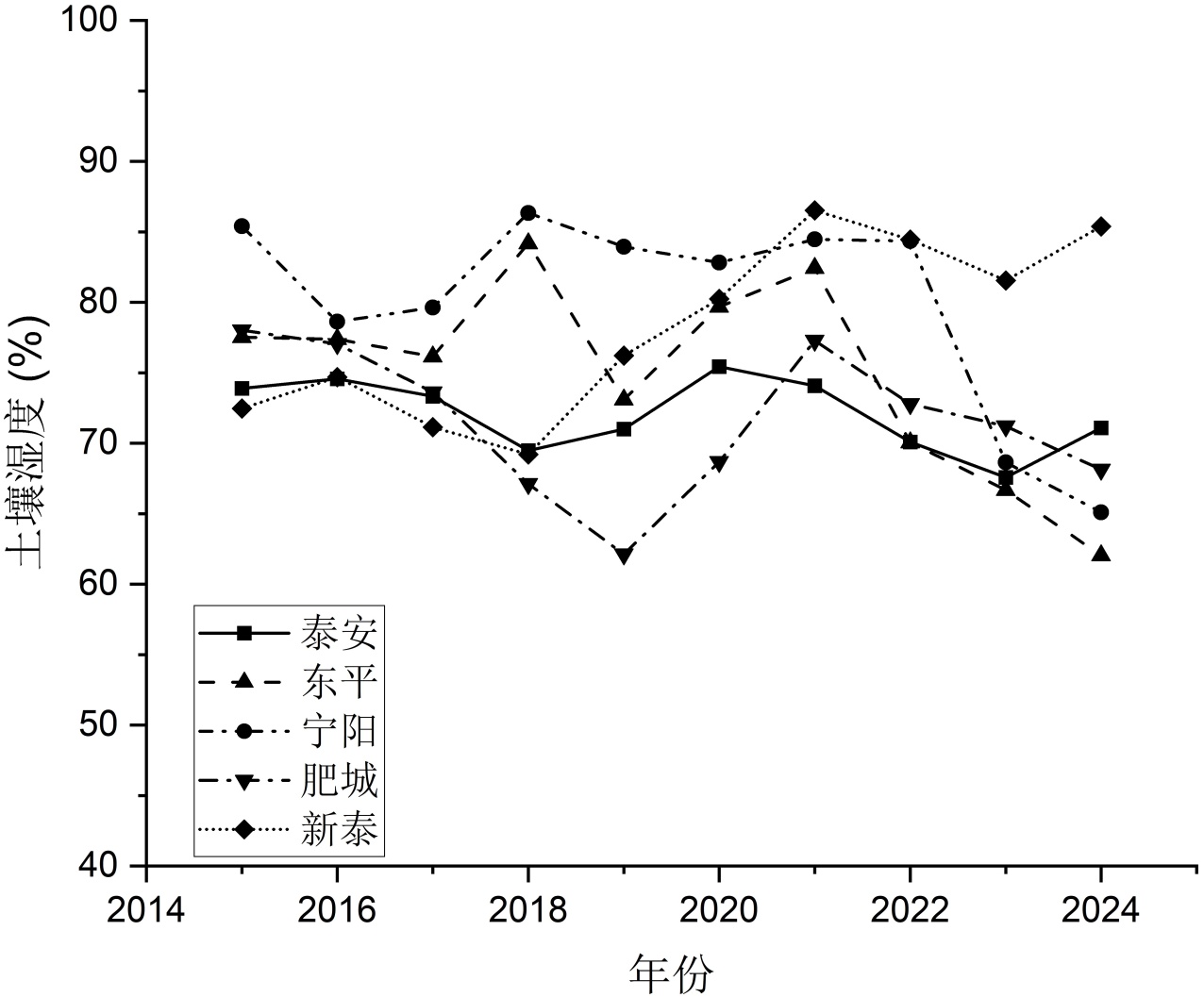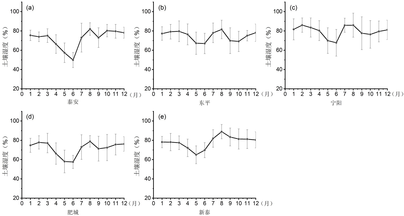 图2展示了研究区五个站点十年平均土壤湿度的月际变化特征。土壤湿度呈现显著的季节性波动,其中5~6月为全年最低值期。此阶段正值春夏季过渡,雨季未到且气温逐渐升高。5月冬小麦进入高耗水灌浆–成熟期,6月收获后地表裸露,蒸发增强。因此,5~6月为土壤水分胁迫最严重期。7~8月,雨季降水使湿度明显回升。雨季结束后的9月至次年3月,湿度相对平稳,波动较小,东平、宁阳和肥城在9月湿度下降后又有所回升,新泰有所下降,泰安在10月上升后湿度维持在相对稳定的状态,此期气温逐渐下降,蒸散减少。春末夏初是区域土壤水分保持的关键风险期。为保障后续作物苗期生长及土壤墒情,需在此窗口期优化灌溉策略,对区域农业水土保持至关重要。