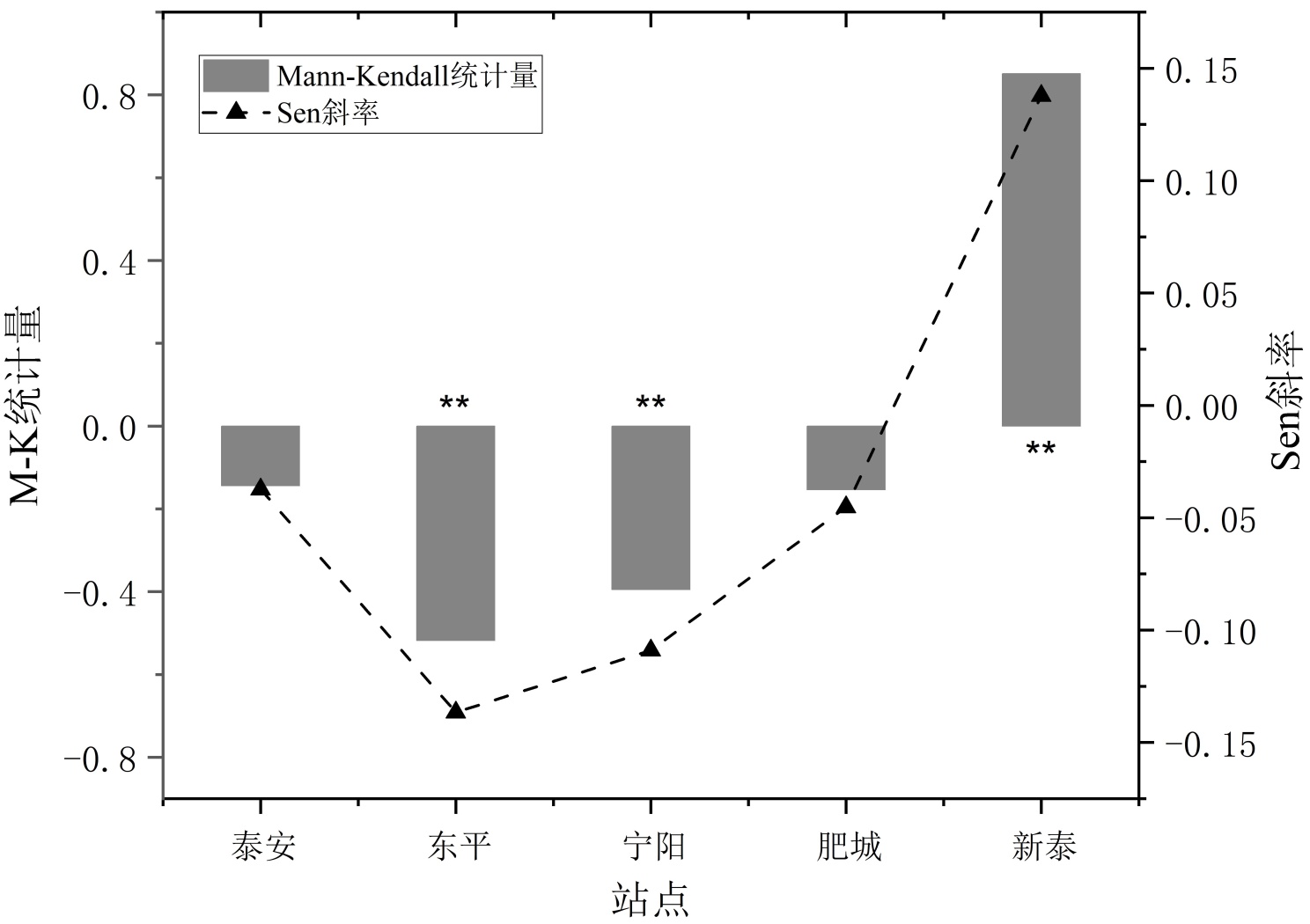 Sen斜率估计法通过计算序列中所有可能点对斜率的中位数来估计趋势的幅度,同样具有稳健性[26]。Sen斜率估计法估计趋势幅度(β)表示单位时间内变量的变化量。