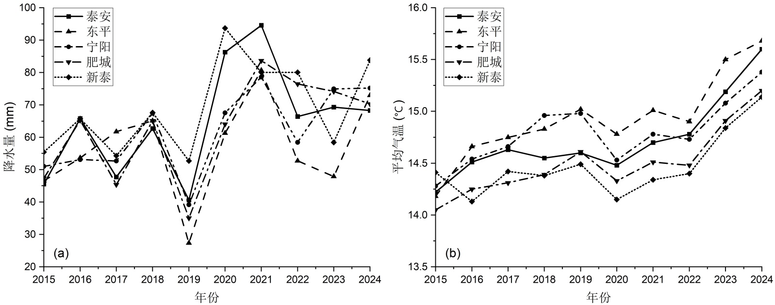 图4. 2015~2024年降水和气温年际变化