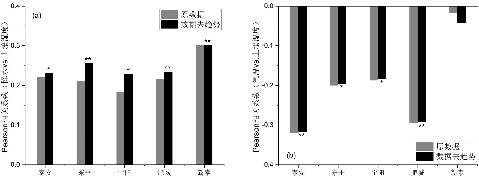 本研究通过Pearson相关性分析揭示区域土壤湿度对降水与气温的差异化响应(图5)。分析过程中对比了原数据与去趋势数据下的相关性差异,发现数据去趋势后土壤湿度与降水的相关性增强,而土壤湿度与气温的相关性有所减弱。下面主要利用去趋势数据所得结果进行分析。结果表明:降水和气温与土壤湿度分别表现为显著的正向与负向驱动作用,但空间异质性显著。降水与土壤湿度呈显著正相关性(r = 0.23~0.30, p < 0.05),其中新泰地区相关性最高(r = 0.301, p < 0.01),表明降水是土壤湿度补给的基础来源。气温与土壤湿度呈显著负相关(泰安r = −0.317,p < 0.01;肥城r = −0.291,p < 0.01),暗示升温通过加剧蒸散发导致土壤水分流失,但新泰地区未通过显著性检验,可能与灌溉补水抵消热耗散有关。区域对比显示,泰安、肥城、东平、宁阳同时受降水和气温的调控;新泰的“显著降水相关–弱气温响应”的组合模式说明降水为土壤湿度变化的显著影响因子。