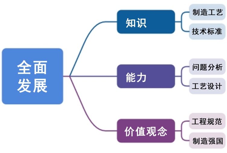 课程内容的重构紧密围绕成果导向教育(OBE)理念,以清晰的知识、能力、素质三维目标为引领(图1),旨在通过深度产教融合,将产业真实需求与技术前沿系统性植入教学。在知识维度,课程目标确保学生掌握从机械加工基础、通用制造工艺到锅炉、汽轮机、制冷机等特定能源装备制造工艺的扎实理论。重构的核心在于,使每一知识单元都与具体的产业技术链条形成强关联,其设计逻辑遵循构思–设计–实现–运作(CDIO)工程教育模式的全周期思维,使学生在学习具体工艺时即能理解其在完整产品生命周期中的位置与价值。在讲授“通用制造工艺”中的无损检测时,同步引入上海电气集团的企业内部标准与典型缺陷案例库,使抽象的国家标准与具体的工程判据相结合,实现了理论知识的“情境化”与“标准化”融合。在能力维度,课程旨在培养学生制定工艺方案、识别并解决制造难题的系统工程能力。为此,教学内容深度融入教师的横向科研项目与产业前沿课题。在“锅炉制造工艺”模块中,将教学团队在百万千瓦等级锅炉混煤燃烧技术研究、核电汽水分离再热器性能试验等国家级项目中的发现,转化为分析“制造精度对热工水力性能影响”的综合性案例,引导学生在掌握经典工艺的同时,建立“设计–制造–性能”关联的系统分析思维。在素质维度,课程着力塑造学生的科技报国情怀、工匠精神与工程伦理意识。这不仅通过挖掘校史、行业奋斗史中的思政元素来实现,将合作企业劳动模范所代表的精益求精、追求卓越的实践精神,作为鲜活的素质培养素材,有机嵌入对操作技术的知识点讲解中,使价值引领具象化为可感知、可效仿的职业行为准则。