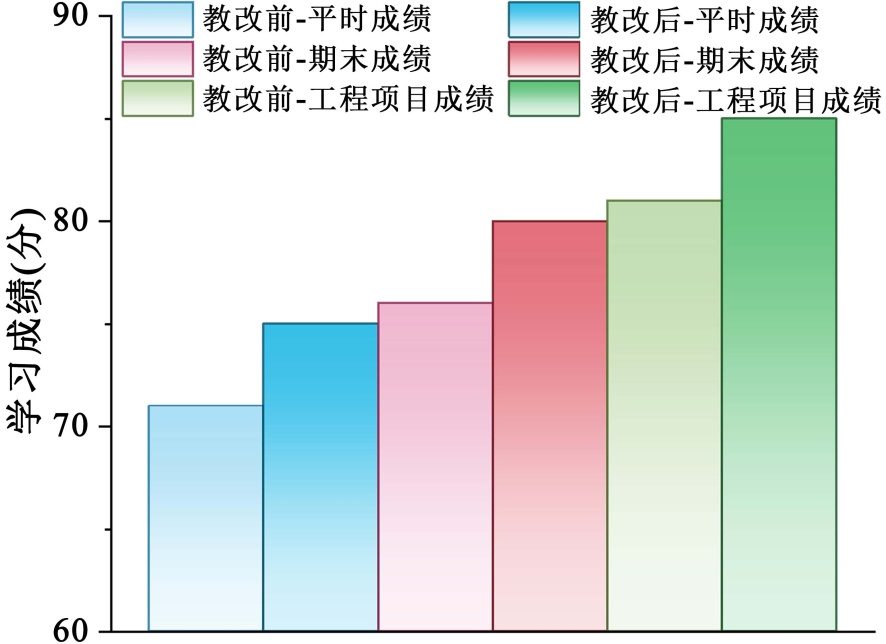 为进一步客观评估课程改革成效,本研究收集并对比了改革前后学生在期末平时成绩、考试成绩以及工程设计项目成绩数据(图4)。平时成绩和期末考试成绩分布对比显示,教改后学生的平均分提升了约5%。工程设计项目评分中,学生们的平均得分均有显著提升。这表明,课程改革在提升学生学业成绩方面取得了显著成效,为教学模式的持续优化提供了依据。