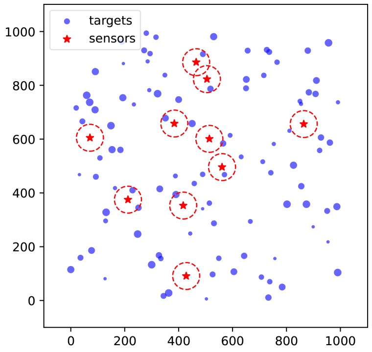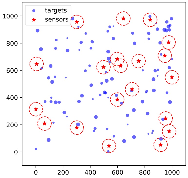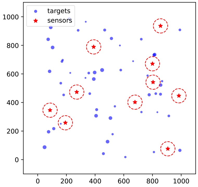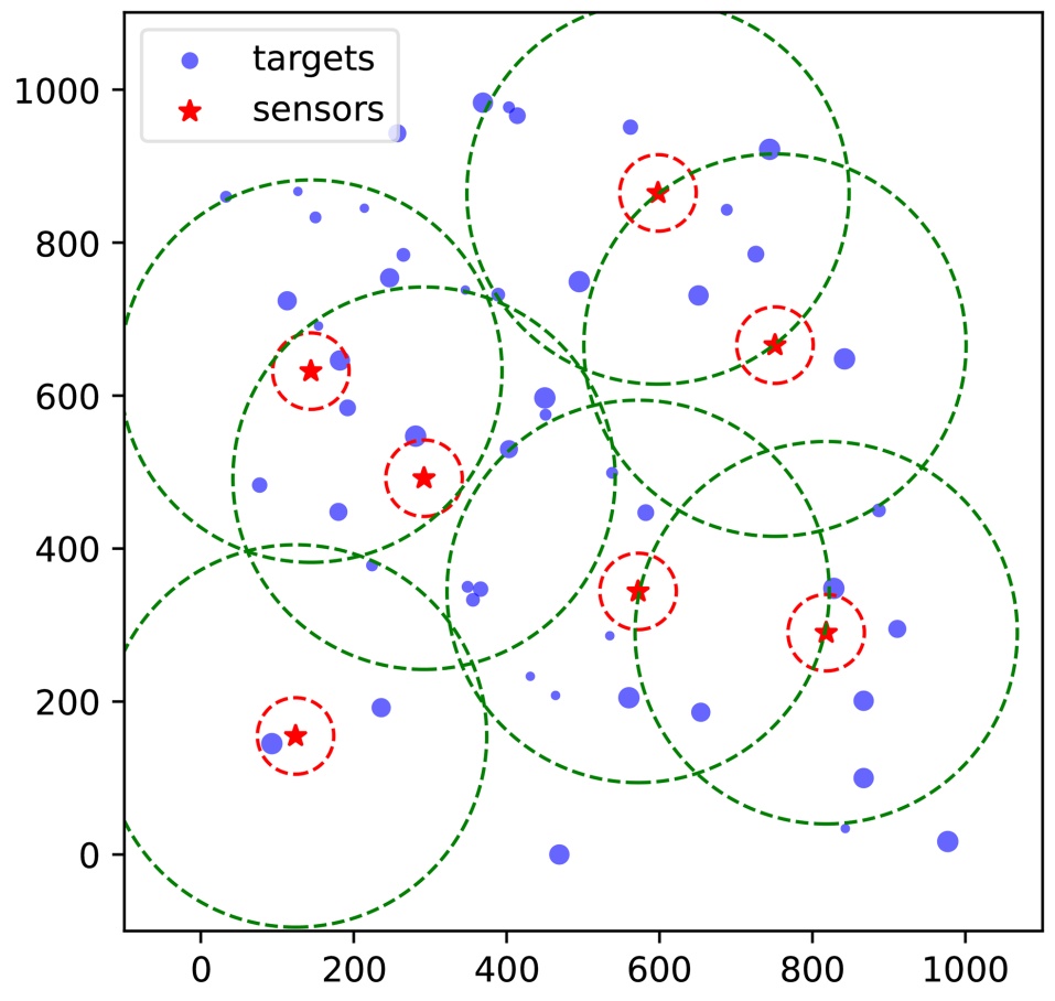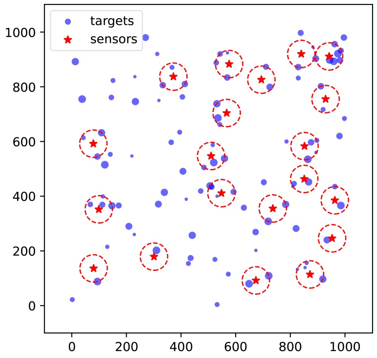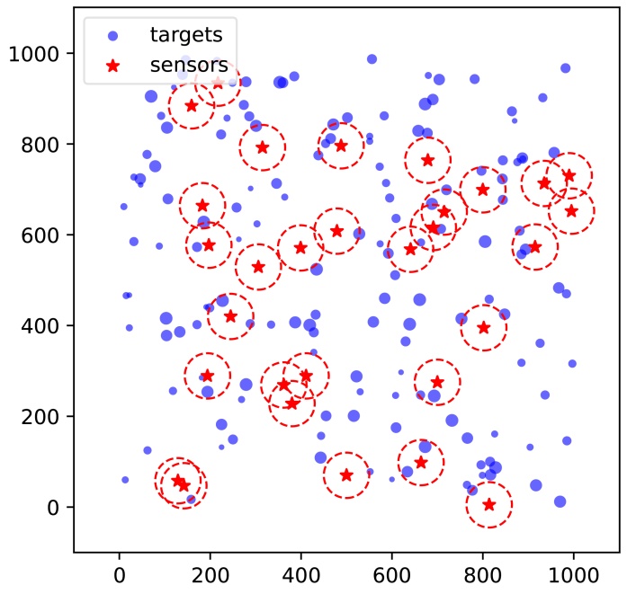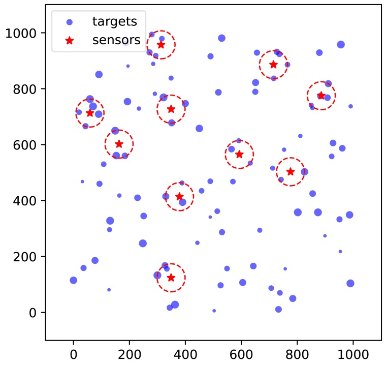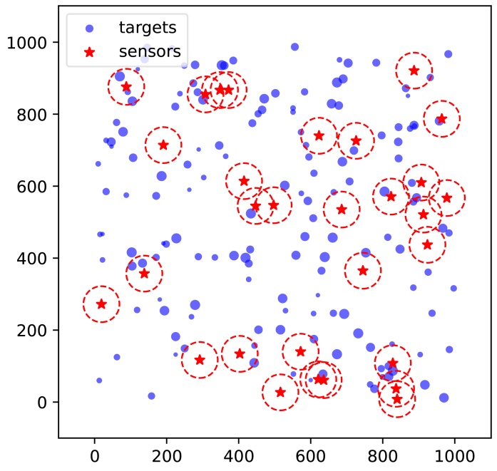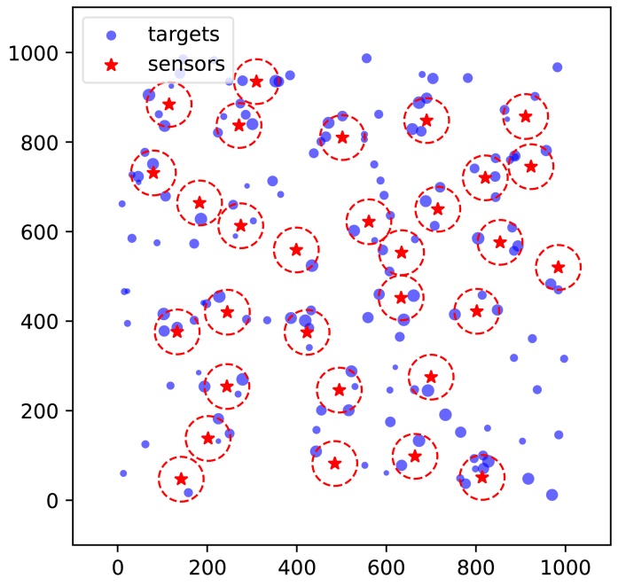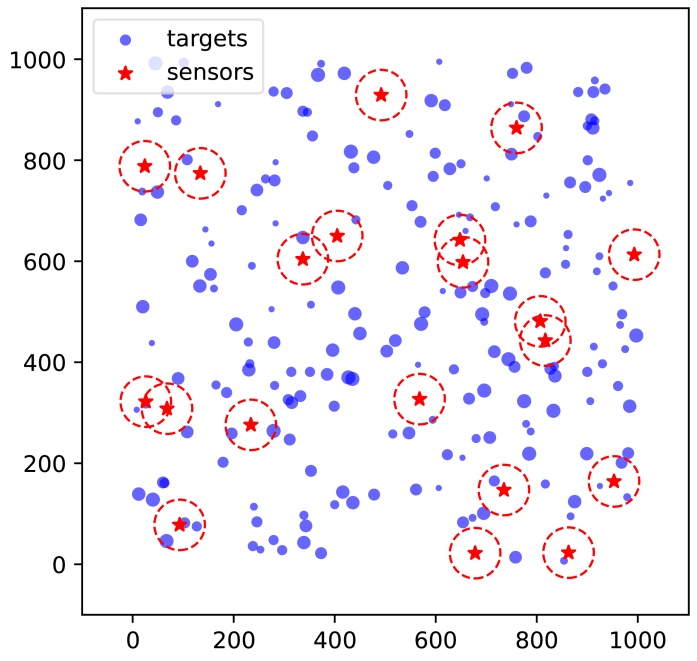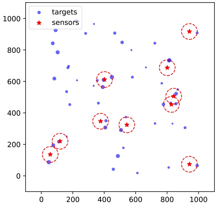 在图1中,传感器和目标分布在1000 × 1000的二维离散网格上。红色五角星表示传感器