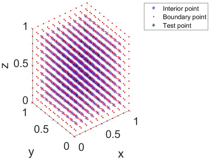 本文在三维波动方程的数值求解中,分别考虑了规则与不规则计算区域,并相应设置了配点集。采用随机方式生成配点,规则区域内随机配点集合为: