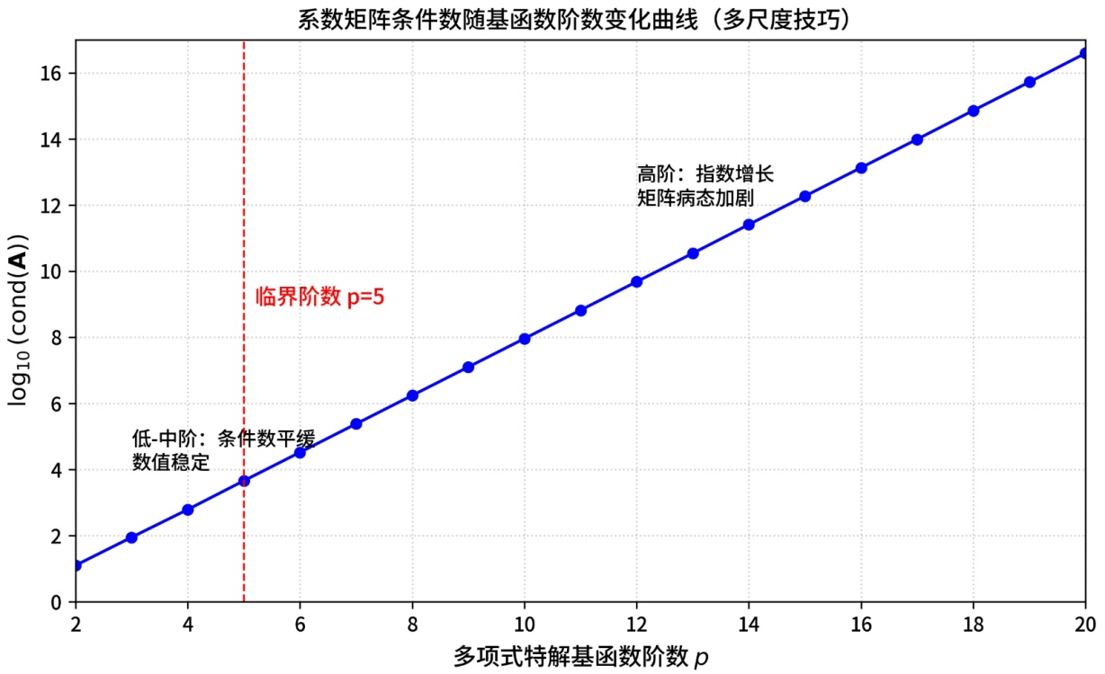 图2. 矩阵条件数随多项式特解基函数阶数的变化曲线图