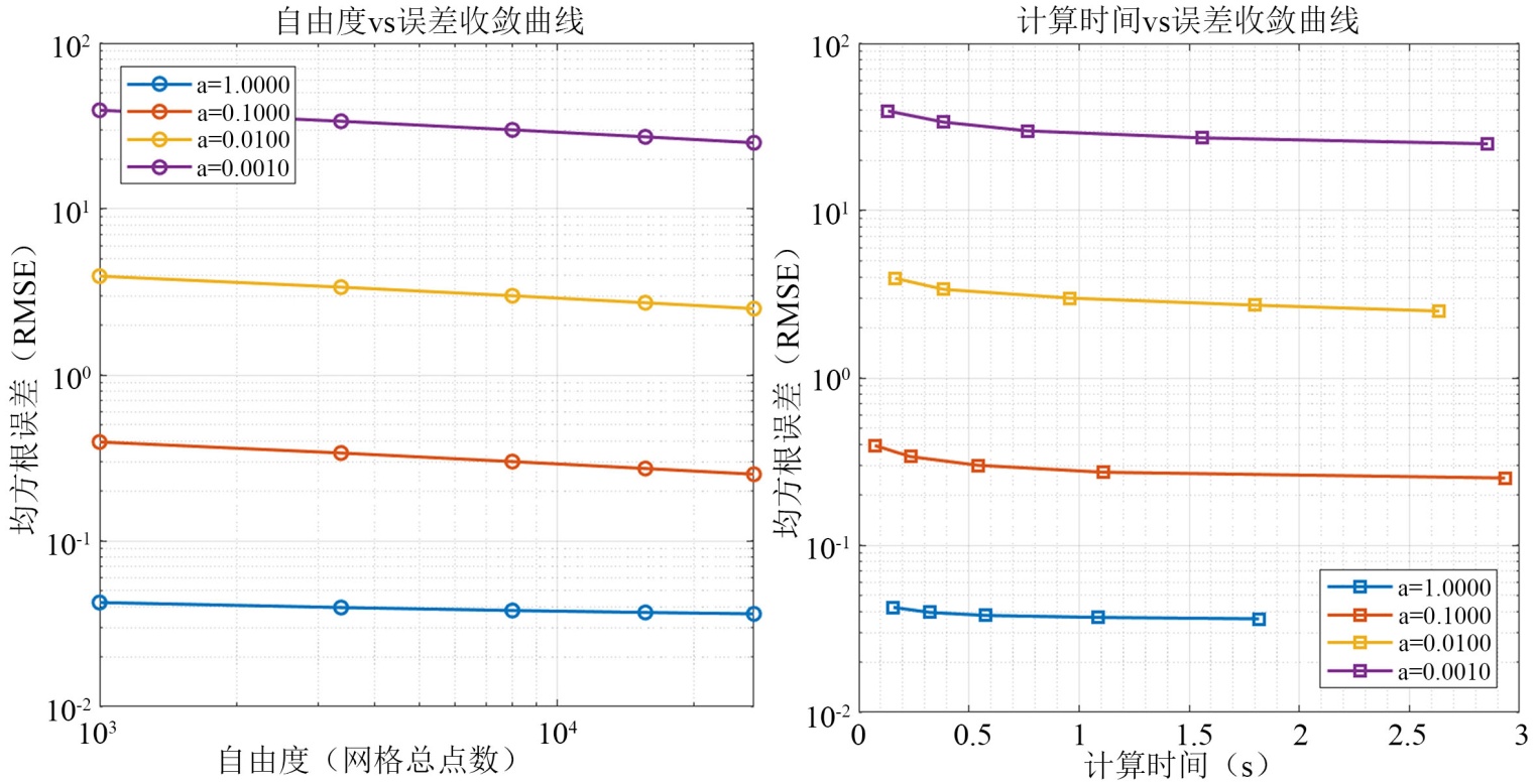 本文结合波动传播的物理背景,采用均方根误差(RMSE)对算法精度进行量化评估。该指标能够直接反映数值解与真实波场在能量意义上的整体偏差即RMSE越小,表明算法重构的波前相位、振幅及能量分布与物理实际越吻合。这一评估方式既能从统计角度衡量全局精度,也符合波动问题中能量表征的核心物理思想。本文通过计算均方根误差(RMSE)来检验该算法的精度: