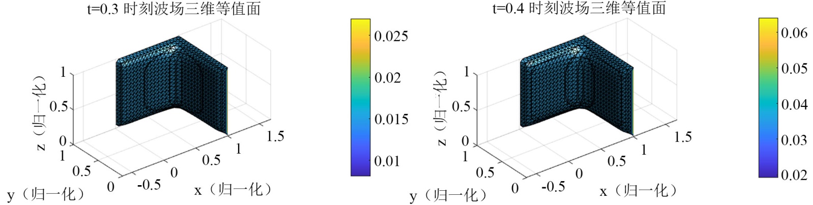 图4. t = 0.3、t = 0.4时刻波场三维等值面图