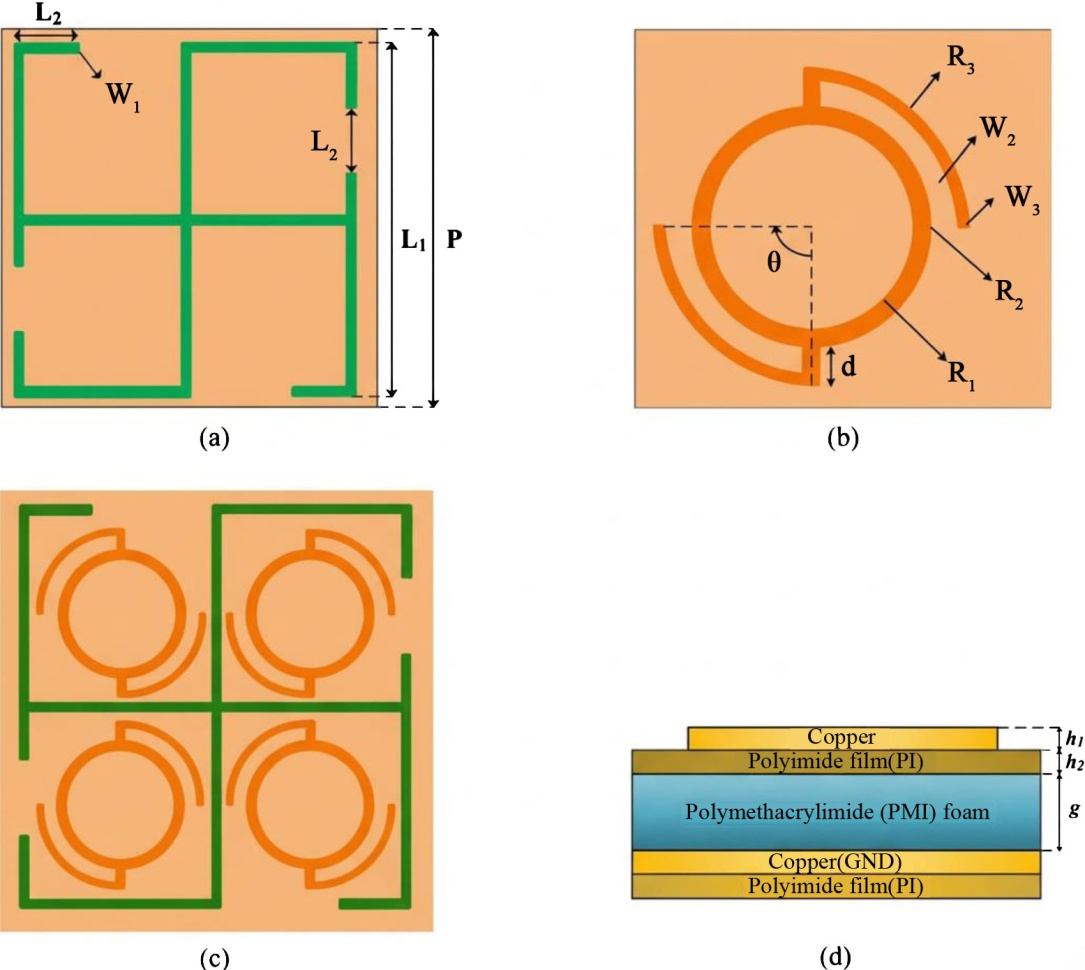 图1. 所提出的双频反射阵列单元结构。(a) C波段单元;(b) X波段单元;(c) 双频反射阵列单元;(d) 分层结构