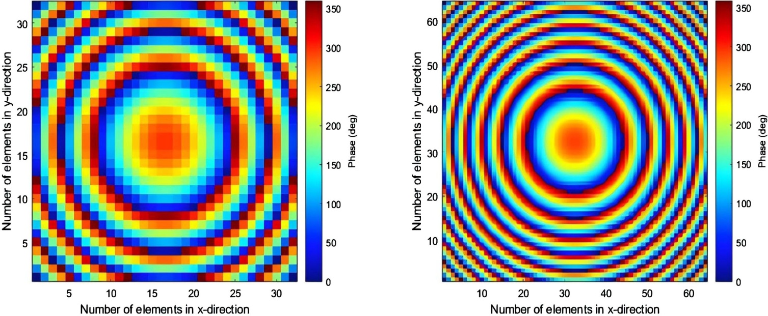 其中,k₀ = 2π/λ₀表示自由空间波数,λ₀为自由空间波长;(xf, yf, zf)为馈源天线相位中心的坐标。在获得所需的阵面相位分布后,可通过建立单元几何尺寸与反射相位之间的对应关系,从而确定每个反射阵单元的物理尺寸,以实现目标反射相位。本文采用方形平面反射阵结构,阵面由16 × 16个C频段单元与64 × 64个X频段单元构成。除单元数量外,阵列性能还受到馈电方式、焦距与口径之比(F/D)等参数影响。本文中,馈源相位中心到阵面中心的距离取F = 664 mm,对应的焦径比为F/D = 0.63。图4是MATLAB中理想条件下对平面反射阵的相位情况。