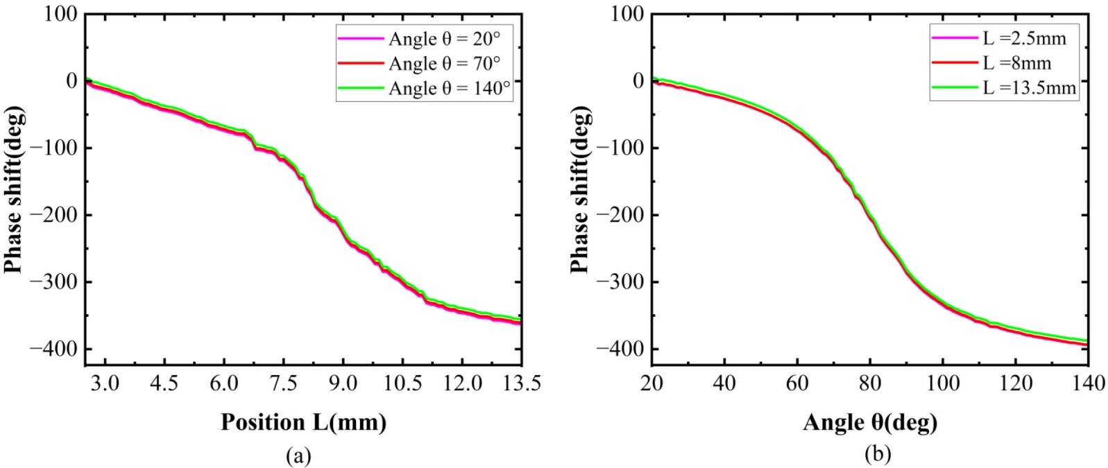 为了验证C/X双频段反射阵单元在调相过程中的独立性,本文对单元进行了交叉参数扫描分析。如图6所示,在4.6 GHz频率下,当C频段单元的调相长度L2在2.5 mm至13.5 mm范围内变化时,选取X频段单元的三组代表性旋转角(θ = 20˚, 70˚, 140˚)进行仿真。结果显示,不同旋转角度下的相移曲线高度重合,表明X频段的状态对C频段的相位响应几乎没有干扰。同理,在9 GHz频率下,当X频段单元的旋转角θ在20˚至140˚范围内调节时,改变C频段单元的长度L2 (2.5 mm, 8 mm, 13.5 mm),其相移响应同样保持一致。这种良好的解耦性能得益于C频段网格结构与X频段圆环分支在物理尺寸上的显著差异以及单层空间的正交布局。仿真结果证明了该单元能够实现双频段反射相位的独立、精确控制,为高效率共享孔径设计奠定了基础。