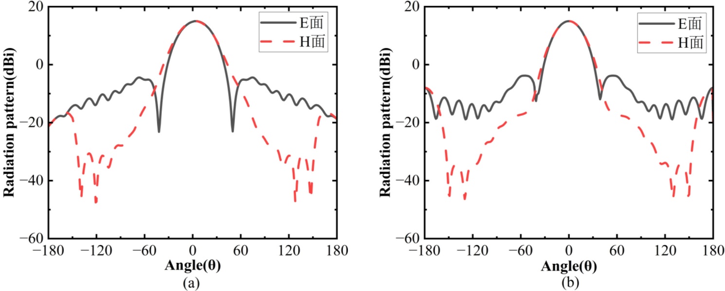 两频段馈源均沿阵面法向布置,其相位中心坐标设为(xf, yf, zf) = (0, 0, 664 mm),与上述焦径比保持一致。C波段馈源天线的E面与H面的方向图如图7(a)所示,X波段馈源天线的E面与H面的方向图如图7(b)所示。