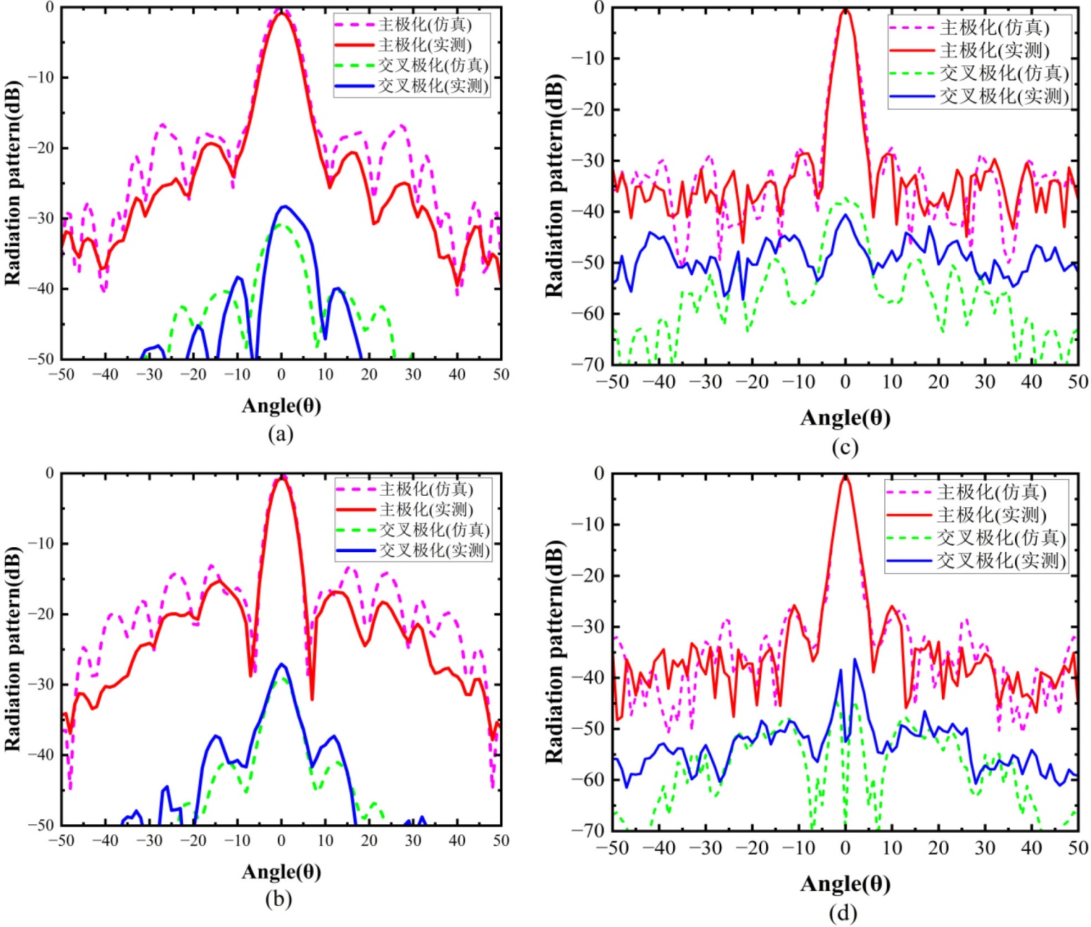 图10. 4.6 GHz频率下的实测和仿真的归一化辐射方向图。(a) 方位向;(b) 俯仰向和9 GHz频率下的实测和仿真的归一化辐射方向图;(c) 方位向;(d) 俯仰向