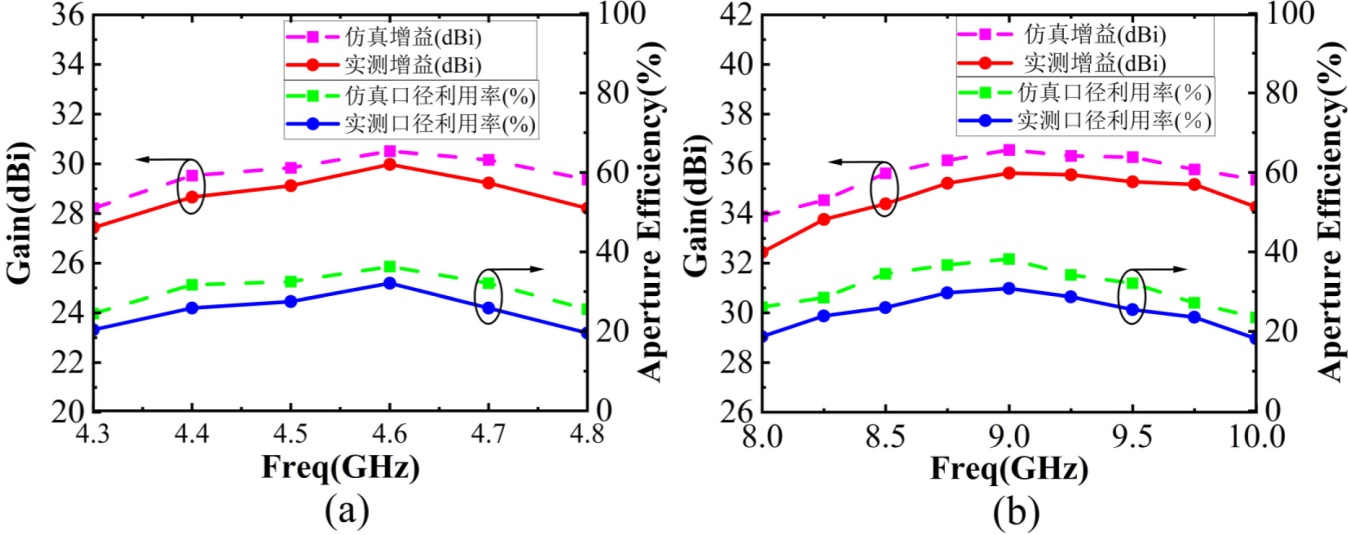 图11. 模拟和实测增益及孔径效率。(a) C波段;(b) X波段