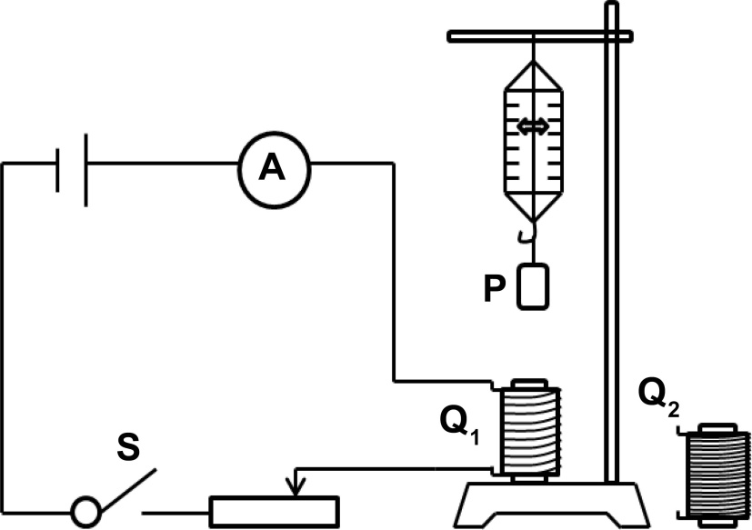 测力计,测力计下方悬挂有铁棒。当螺线管中通入电流时,电磁铁Q1吸引铁棒P使测力计的示数发生变化,从而将电磁铁磁性强弱转化为测力计示数的大小[7]。该实验的优势在于实验现象直观明显。其不足之处主要体现在以下几个方面[8] [9]:一是电磁铁与铁棒之间的距离对二者的磁吸引力影响显著,当电磁铁与铁棒的间距缩小时,电磁铁与铁棒之间的磁吸引力呈非线性增强。当电磁铁对铁棒的吸引力变化时,电磁铁与铁棒之间的距离也随之变化,致使实验未严格遵循控制变量原则;二是弹簧测力计的精度等级通常为0.1 N,难以精准捕捉磁力的微小变化。