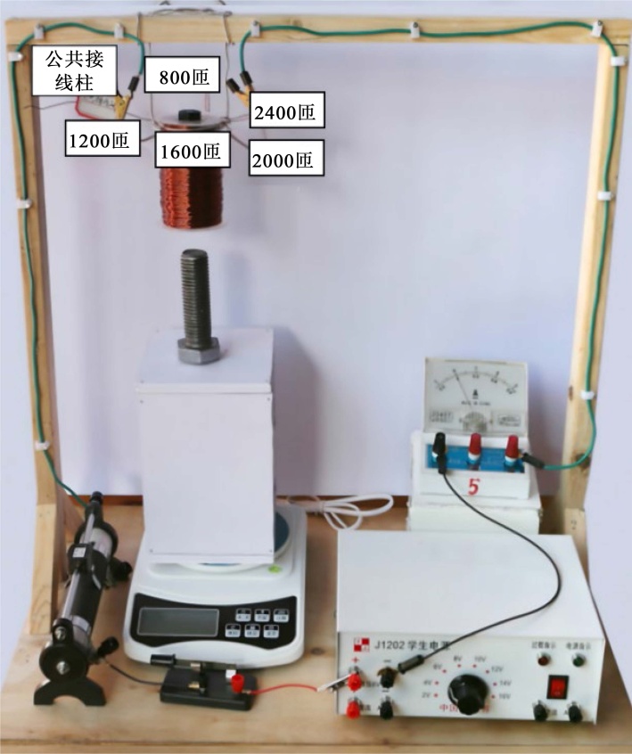 可调匝数螺线管:可调匝数设置有公共和一级至五级的线圈接线端口,将直径为0.5 mm左右的漆包线缠绕在长度为8 cm、内径为1.7 cm的工字形塑料绕线筒上制作而成。绕制过程中,先将漆包线的一端作为公共接线端,当漆包线绕制至800匝时,预留出一段漆包线进行去绝缘处理后作为一级线圈接线端;绕制至1200匝、1600匝、2000匝和2400匝时,依次预留出一段漆包线进行去绝缘处理后分别作为二级、三级、四级、五级线圈接线端。