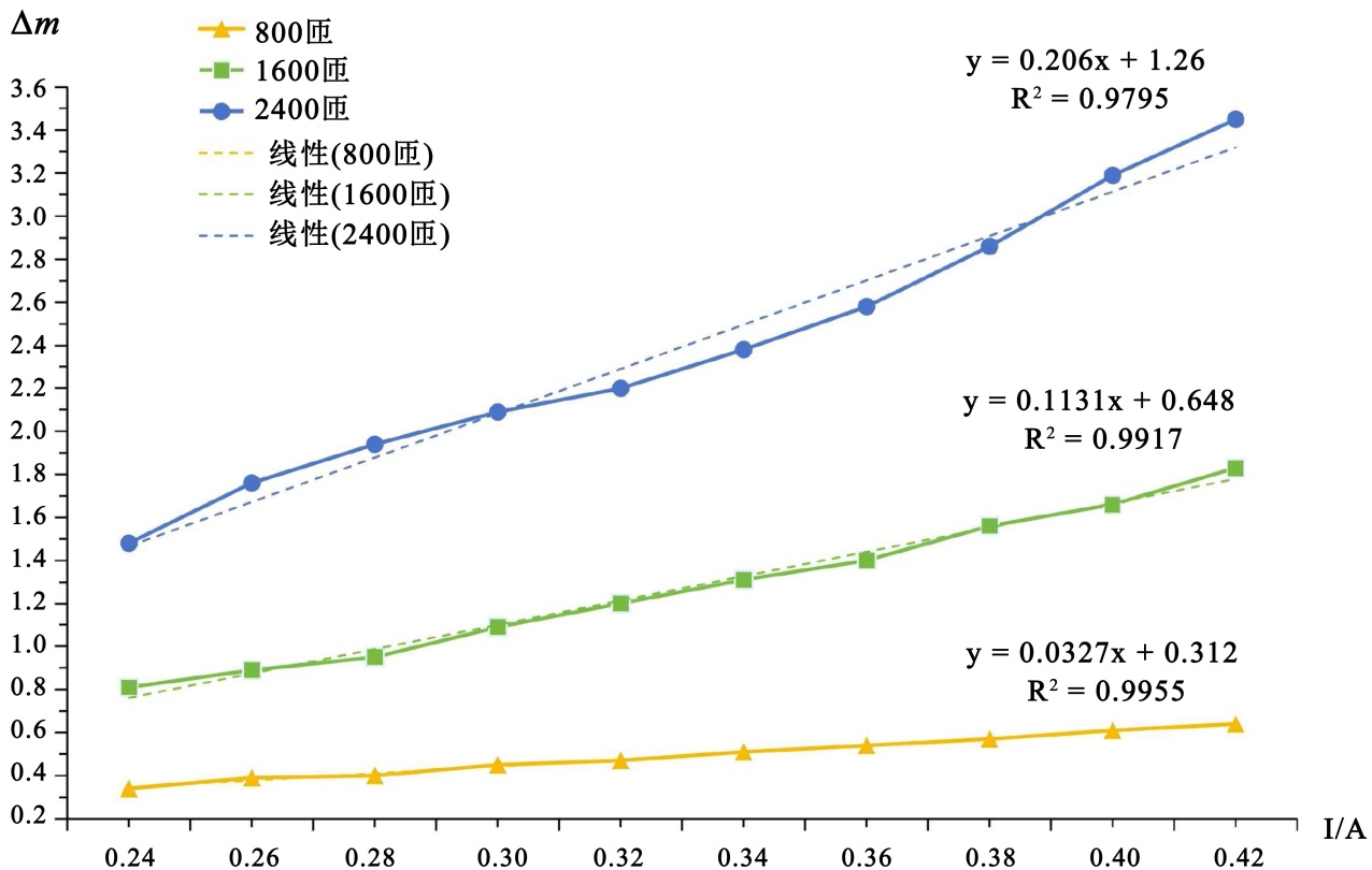 将上述表1实验数据导入origin软件,分别作出800匝、1600匝、2400匝的螺线管插入相同铁芯接入电路中后,通入不同大小的电流时电子秤示数变化量和电流大小间的关系图,得到如图4所示的