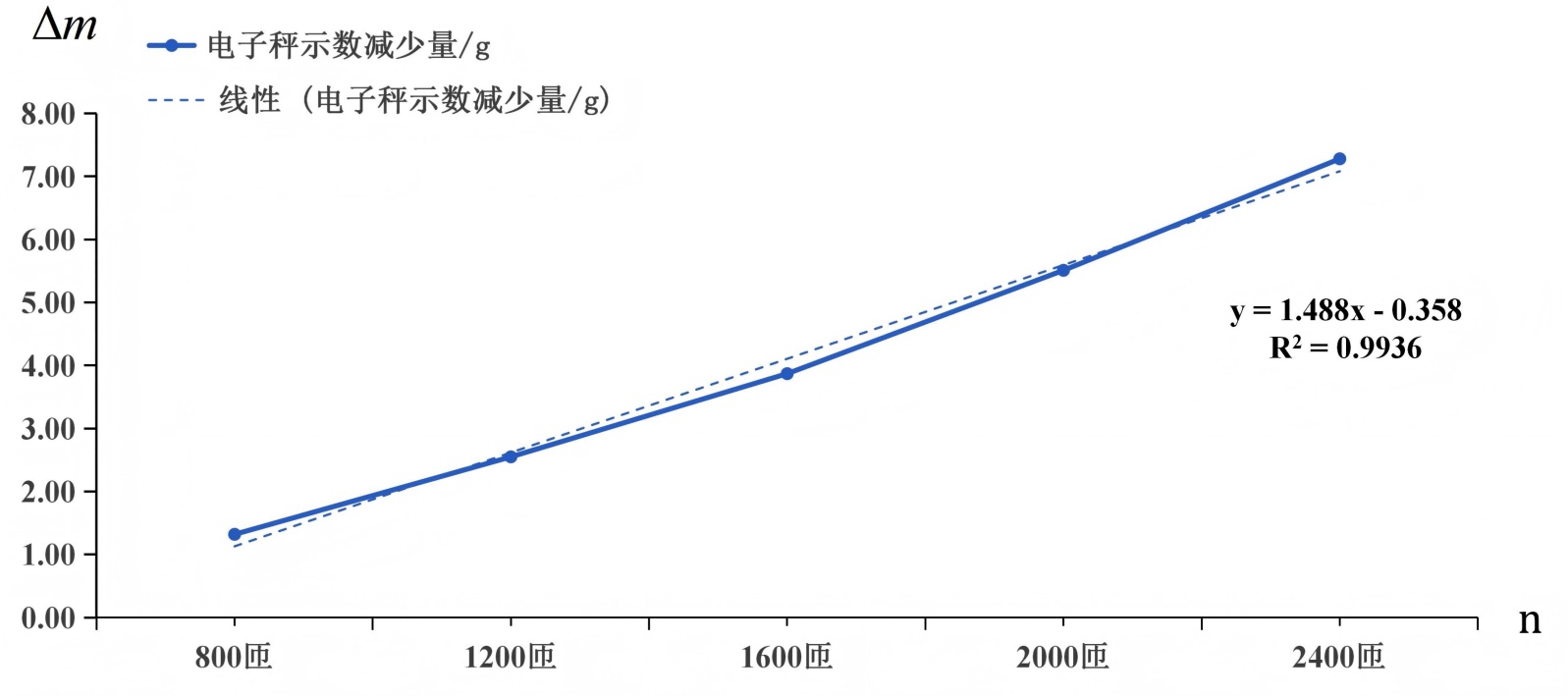 。相关系数R2接近1,表明在铁芯与电流保持不变的条件下,电子秤示数减少量与线圈匝数之间存在显著的线性关联。因此,在铁芯与通过螺线管的电流一定时,螺线管的线圈匝数越多,其对软铁棒的吸引力越强。由此可得电磁铁的磁性强弱与线圈匝数呈正相关关系。