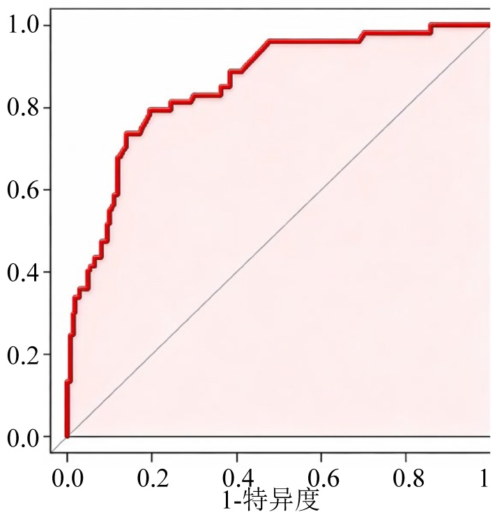 以ROC曲线分析脑梗死静脉溶栓治疗转归不良风险列线图预测模型区分度,AUC为0.859 (95% CI: 0.796~0.921),区分度良好。见图2。