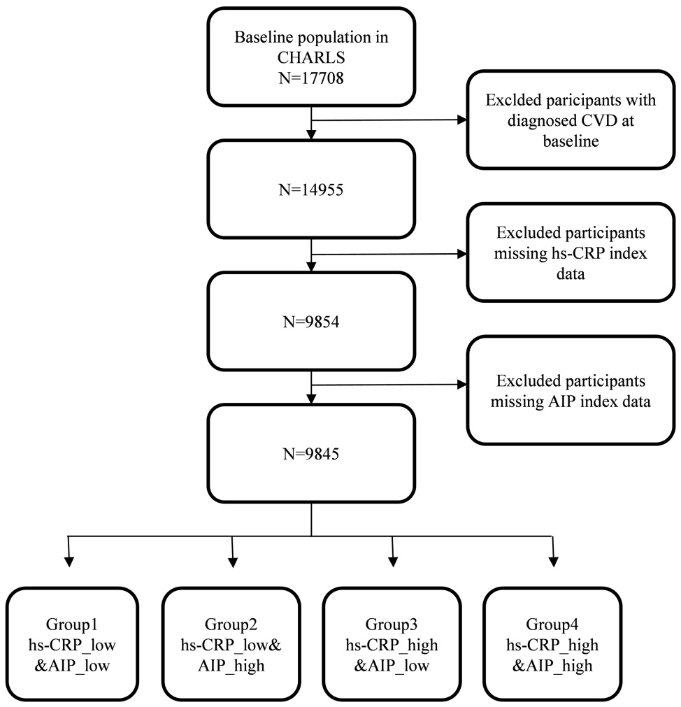 在2011年进行的基线调查中,有17,708人参与。我们应用了以下排除标准:缺乏hs-CRP和计算AIP所需的血液测量的参与者被排除在外;此外,排除了那些在基线时诊断为CVD的人。应用这些标准后,最终分析包含9845名参与者。图1说明了参与者纳入和排除的流程图。