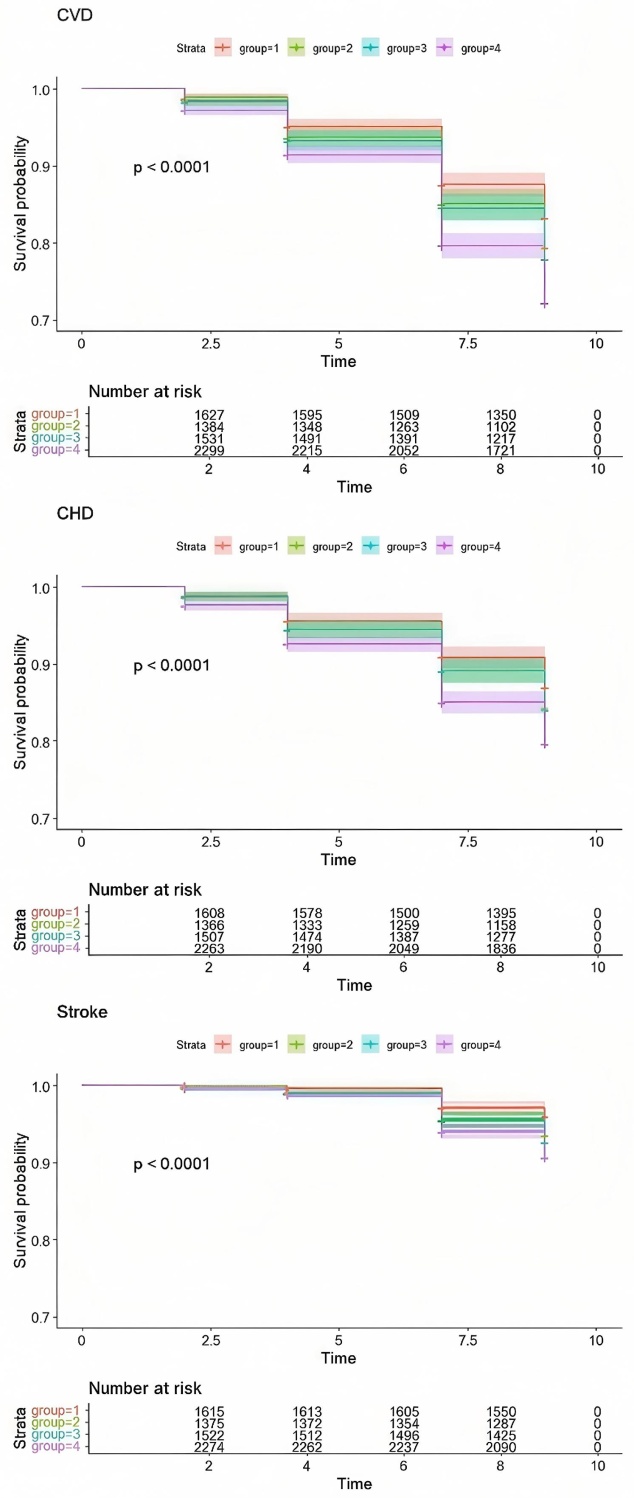 为了评估CVD、HD和Stroke的发生率,我们运用Kaplan-Meier生存分析法,对4个hs-CRP和AIP联合组的CVD、HD和Stroke累积发生率进行估算。利用Kaplan-Meier法生成累积风险曲线,并通过Log-rank检验评估各组间的差异。