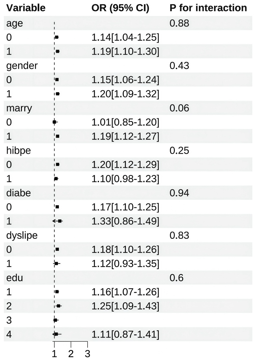 为了进一步验证hs-CRP和AIP之间对CVD风险的交互作用的稳健性,我们对不同性别、婚姻状况、吸烟状况、饮酒状况、教育水平以及患有糖尿病、高血压、血脂异常疾病的个体进行了亚组分析。