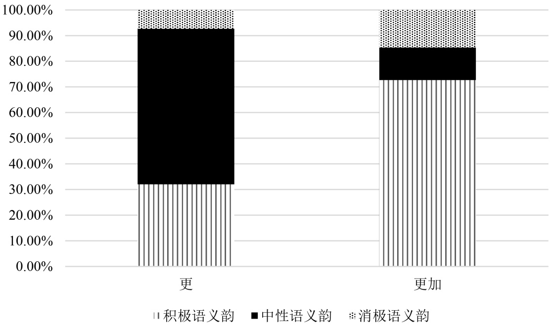 通过语义韵的分析可知,“更”“更加”程度副词均以非消极语义韵为主,这与两类副词很少与消极语义的词汇形成搭配的概率低有关。呈现积极语义韵的是“更加”,“更”呈现中性语义韵。