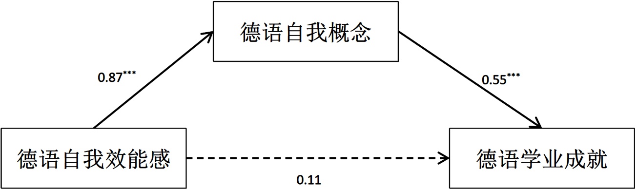 本研究最终得出以下结论:1) 西南地区德语中学生的德语自我概念和德语自我效能感均高于平均水平;2) 西南地区德语中学生在德语自我概念和德语自我效能感上均不具有明显性别差异;3) 西南地区德语中学生在德语自我概念和德语自我效能感方面存在明显的年级差异;4) 西南地区德语中学生的德语自我概念、德语自我效能感和德语学业成绩方面存在显著的正相关性;5) 德语自我概念和德语自我效能感都是德语学业成绩的重要预测因素,德语自我概念在德语自我效能感对德语学业成就的关系中起完全中介作用。