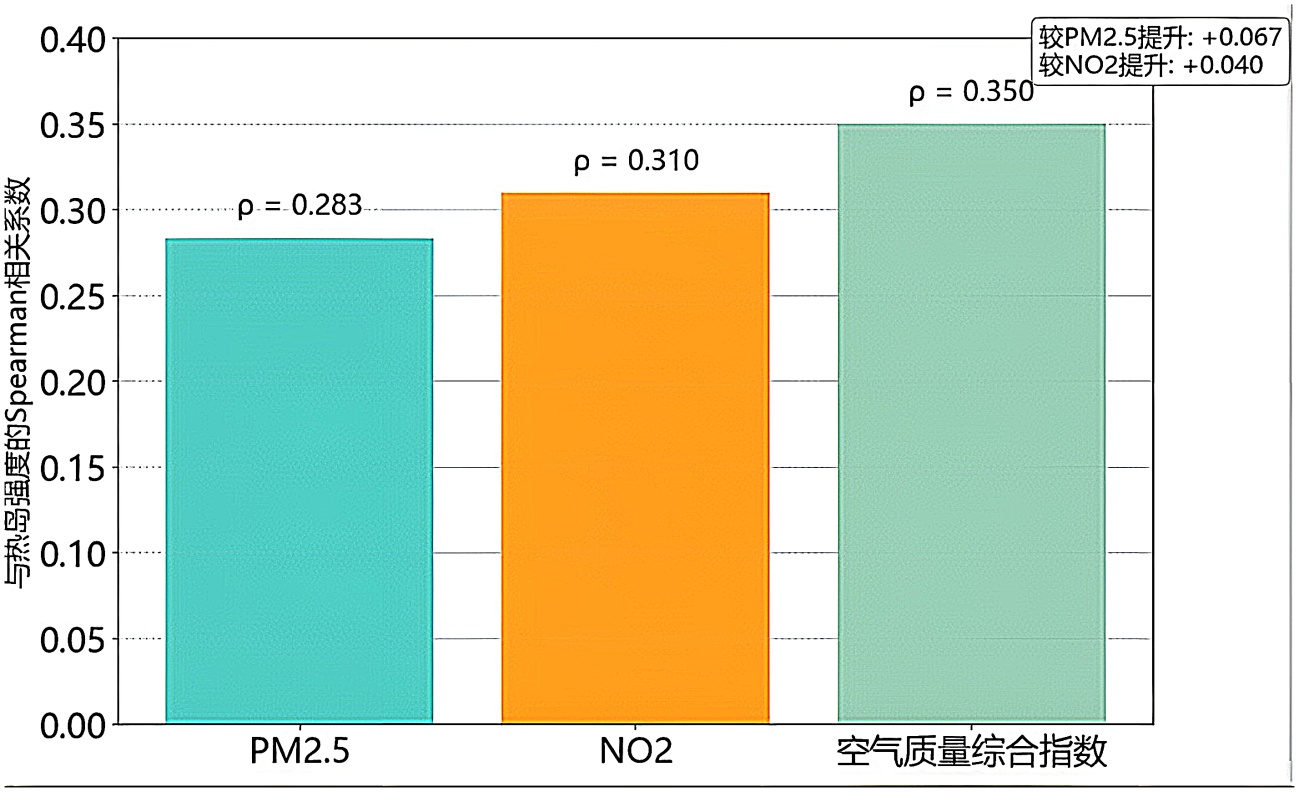 为归一化后的NO2浓度。经Spearman秩相关分析法验证(如图4),该指数与热岛强度的相关系数(ρ = 0.350)较单一污染物平均相关系数(0.296)提升0.054,能更有效反映多污染物的综合效应。