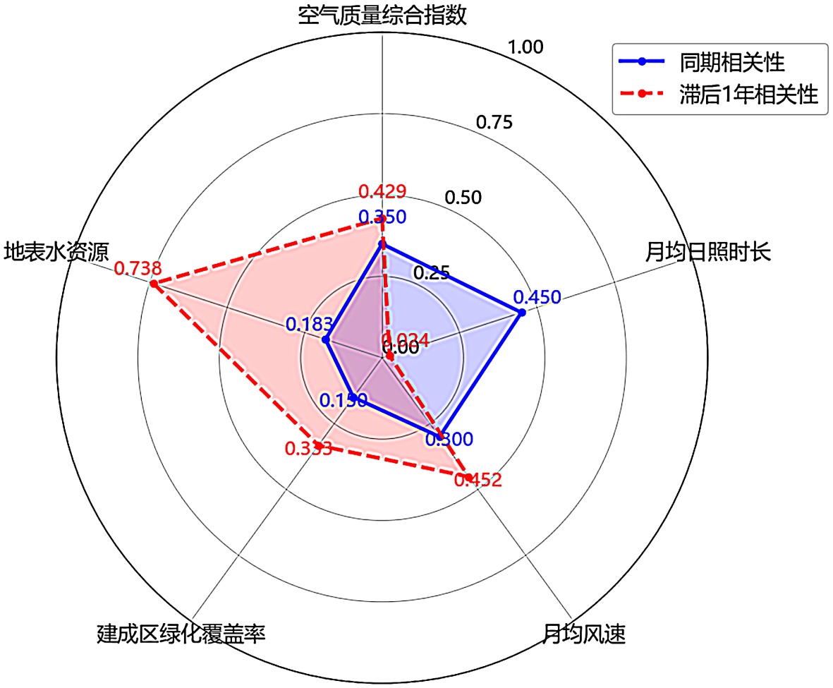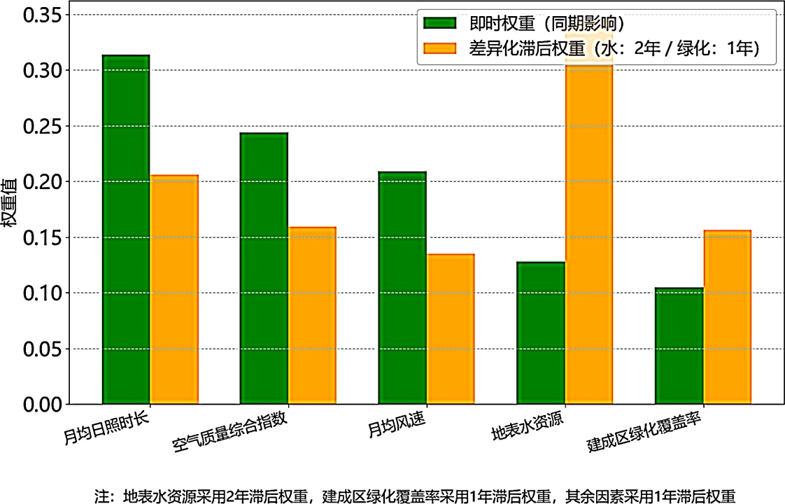 阶段的核心驱动因素;地表水资源(0.128)和建成区绿化覆盖率(0.105)则为次要影响因素,体现出气象和污染条件的实时影响。然而,在滞后一年的累积数据分析中,地表水资源权重跃升至0.345,成为首要影响因素,绿化覆盖率的权重也提升至0.156,这验证了生态因素需经过时间累积才能充分发挥调节作用的特征。