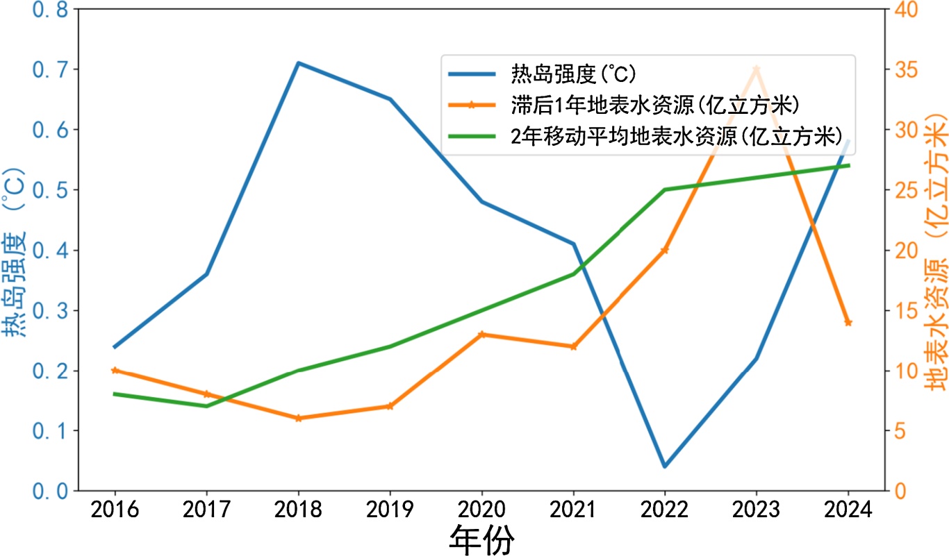 图7. 地表水资源(同期/滞后1年/移动平均)与热岛强度关系图