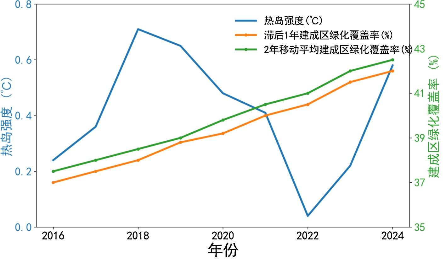 建成区绿化覆盖率(同期/滞后1年/移动平均)与热岛强度关系见图8。其与热岛强度同期相关性较弱(ρ = −0.15),虽沈阳绿化覆盖率已达42.7%,但因绿地布局分散、植被以低矮类型为主,未形成连续降温网络,即时缓解作用有限。滞后1年效应分析显示,二者相关性提升至ρ = −0.343,较同期提高0.193,证实绿化措施存在明显滞后性。从图8可见,2020~2021年绿化覆盖率持续上升,滞后1年对应2021~2022年热岛强度显著降至低谷(0.0376℃),滞后响应特征清晰。经2年移动平均平滑处理后(图9),二者