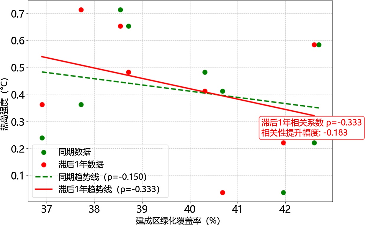 图8. 建成区绿化覆盖率(同期/滞后1年/移动平均)与热岛强度关系图