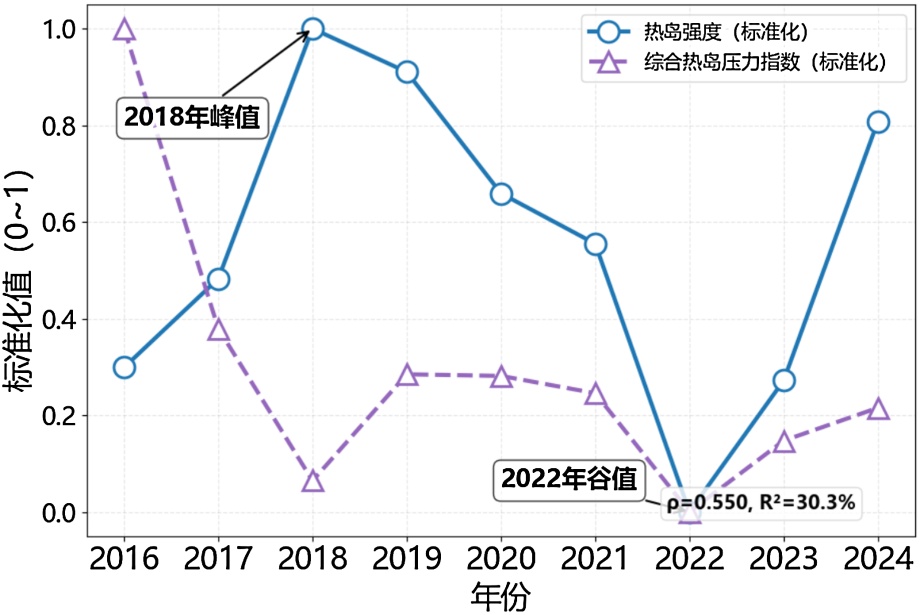 综合热岛压力指数与热岛强度呈中等正相关(ρ = 0.517),具体相关系数见图示。从图10的趋势对比可看出,2018年综合指数峰值(0.92)与热岛强度峰值(0.714℃)对应,2022年指数谷值(0.35)也与热岛强度谷值(0.038℃)对应,二者年际变化趋势高度一致,说明该指数能够有效表征多因素共同作用下热岛效应的主要驱动特征。