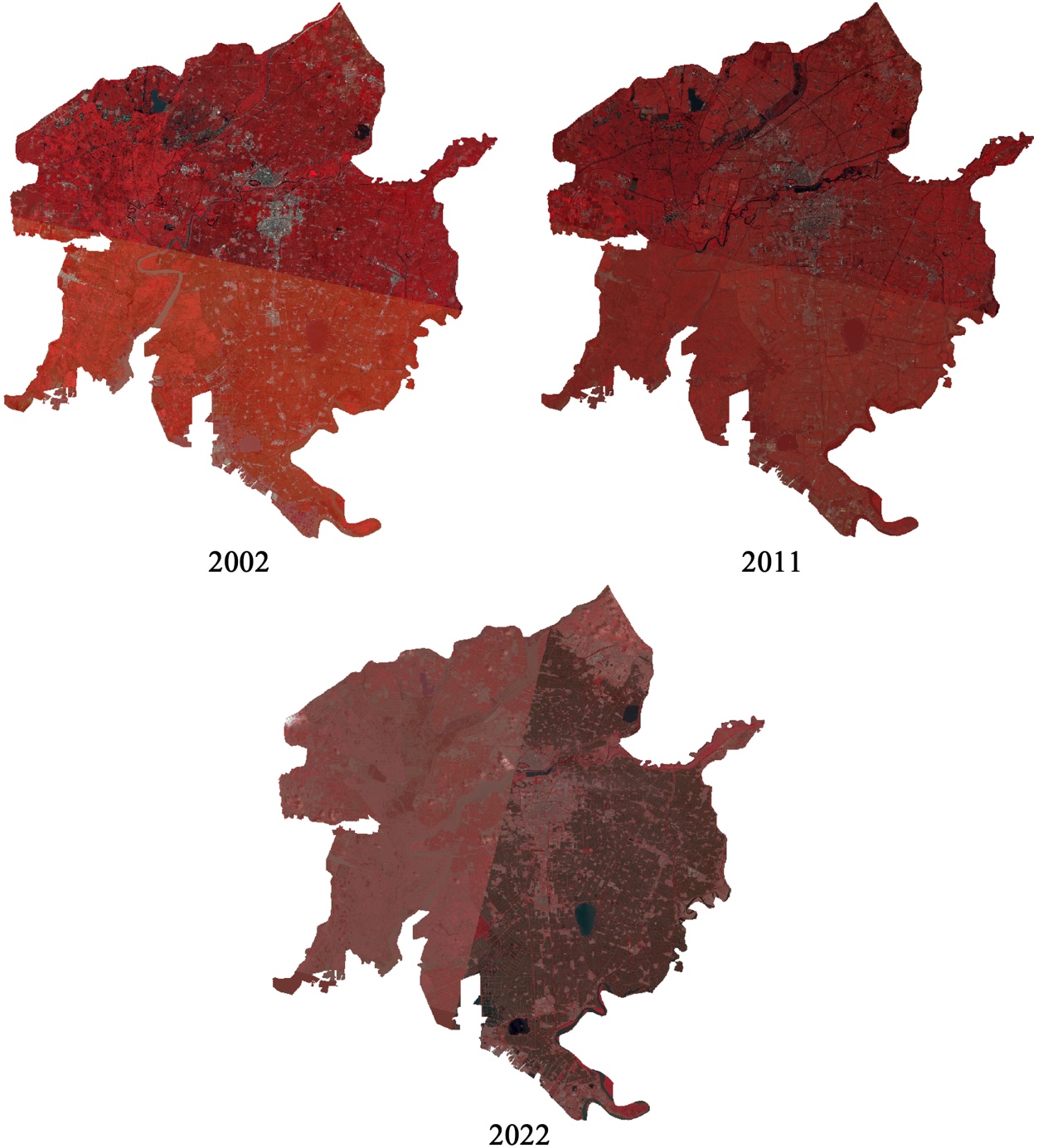 采用ENVI的感兴趣区工具,以盘锦市行政边界矢量文件提取出研究区图像,图4是提取出的2002年、2011年、2022年图像。