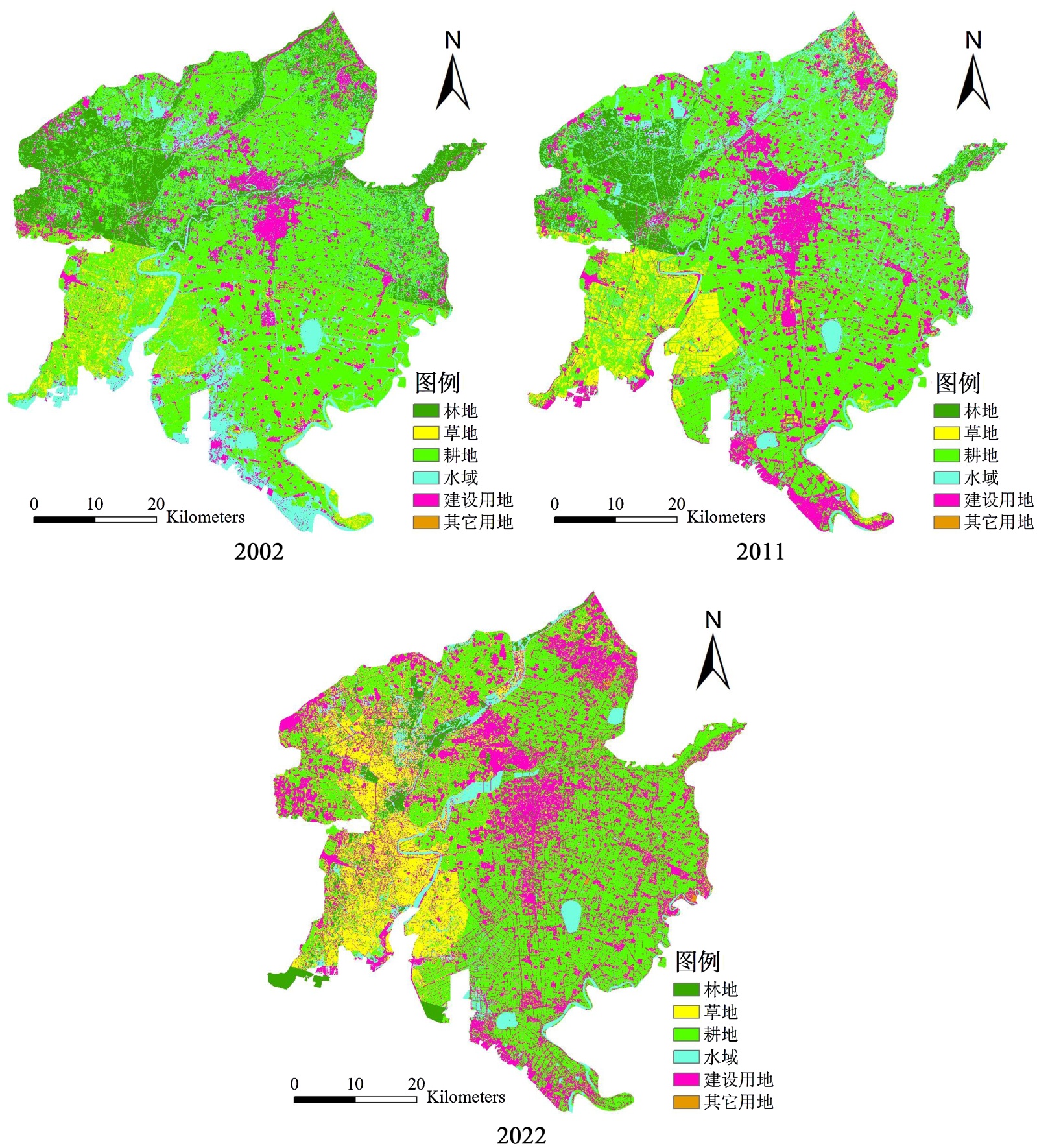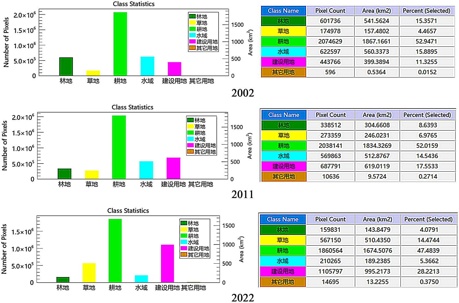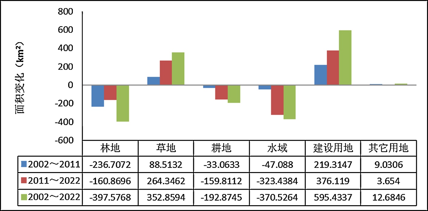 2。从2002年到2022年,建设用地、草地、其它用地的面积在增加,建设用地面积增加最多,增加595.43 km