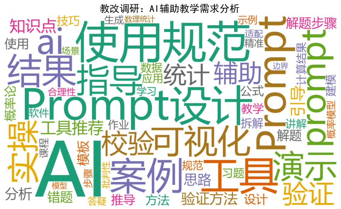 学生AI辅助学习关注点词云分布图见图1。学生的需求主要包括四方面,一是提升提示工程能力,掌握不同学习场景下与AI的精准交互方法;二是培育批判性思维,防止对AI过度依赖;三是期待AI工具与课程核心知识点、高阶学习任务深度融合;四是明确AI使用的边界与学术规范,树立风险意识。这些需求凸显了人工智能时代经管类专业学生在概率论与数理统计课程学习中的成长诉求,为精准育人明确了实施方向。