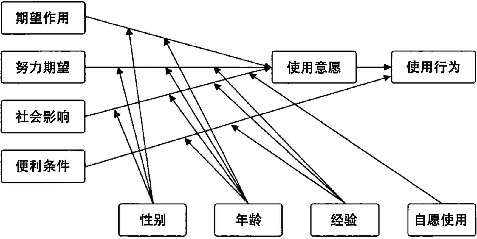 主要使用文献分析法以及案例分析法进行分析,并结合UTAUT模型进行研究,通过UTAUT模型中的四个核心维度具有显著影响的四个变量即性别、年龄、自愿和经验进行分析。UTAUT模型中各核心要素以及变量关系具体如图(图1)所示。