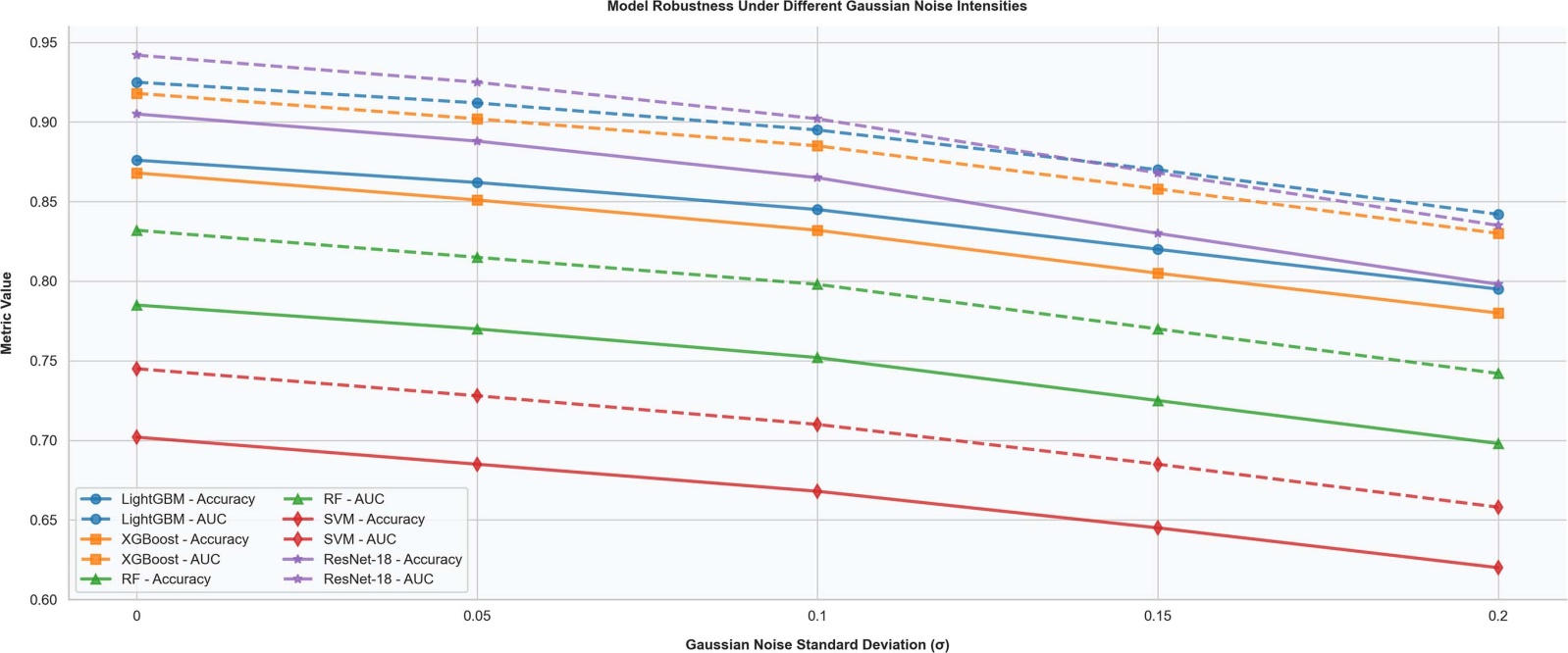 不同高斯噪声强度下,核心模型LightGBM与深度学习基准模型(ResNet-18)的性能变化趋势如图4所示,所有模型的准确率和AUC值均随噪声强度增加呈缓慢下降趋势,未出现性能骤降的情况,验证了所有模型均具有一定的抗噪声能力。