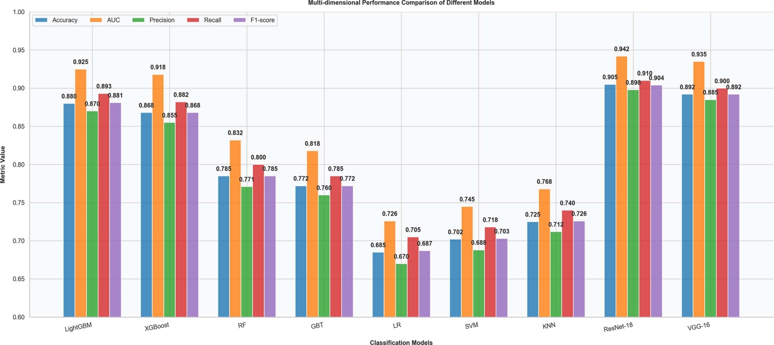 为验证本研究选取的LightGBM、XGBoost核心模型的性能优越性,选取4类经典传统机器学习模型(逻辑回归LR、支持向量机SVM (线性核)、K近邻KNN (K = 5)、梯度提升树GBT)作为对比,并纳入两类经典深度学习模型(ResNet-18、VGG-16)作为性能基准,开展多模型对比实验。