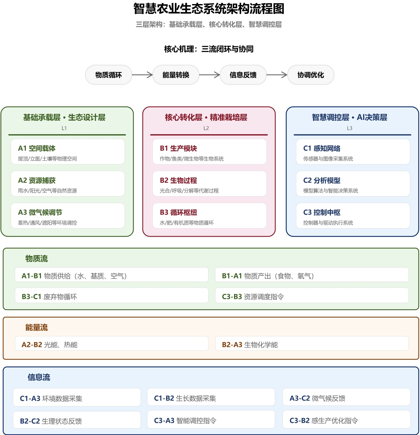 基于前述理论梳理,本文尝试构建一个“智能生态融合体”的概念模型(见图2)。该模型强调物质流、能量流与信息流在三个层级间的闭环循环与动态交互[10]。