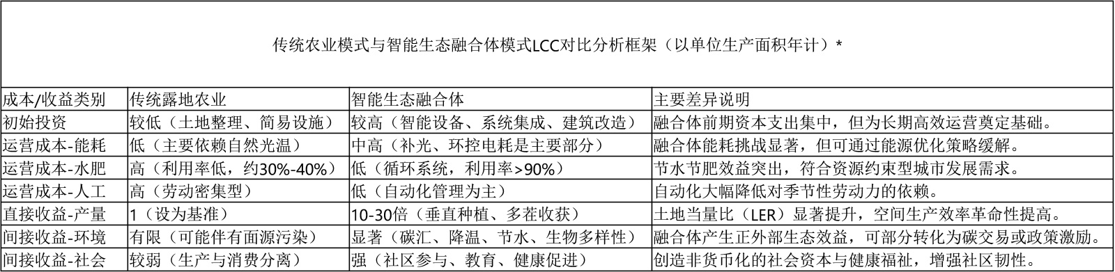 为直观对比,图5构建了一个简化的LCC分析框架。为保证比较的公平性与科学性,该框架以“单位生产面积(例如1平方米或1公顷)在一年内的运营周期”为基准,对两种模式的成本与收益进行标准化核算与对比。