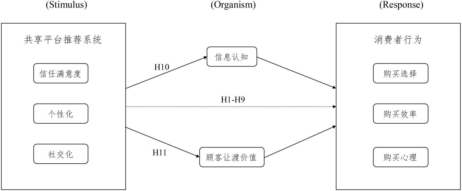 为弥补上述研究缺口,本研究引入“刺激–机体–反应”理论框架,旨在构建并检验一个针对共享经济情境的推荐系统影响机制模型。具体研究问题包括:(1) 共享平台推荐系统的信任满意度、个性化与社交化特征如何直接影响消费者行为?(2) 信息认知与顾客让渡价值是否在上述直接影响路径中发挥中介作用?本研究通过对典型共享平台用户的实证调查,力求在理论上厘清共享情境下算法推荐的作用路径,在实践上为平台优化推荐算法设计提供依据。
