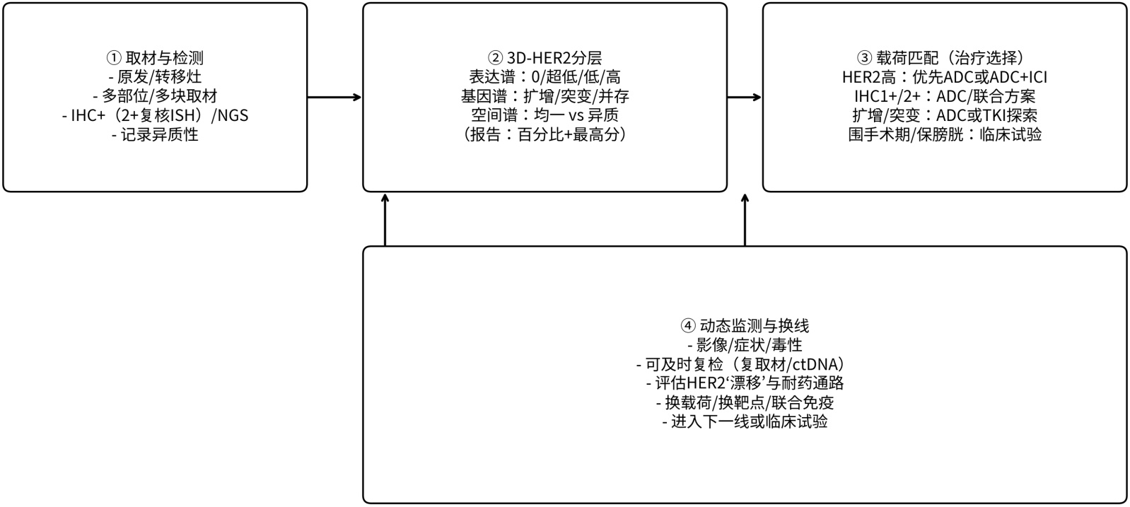 图1. “3D-HER2分层 + 动态监测 + 载荷匹配”的临床路径示意图(从取材/检测–分层–治疗选择–复测/换线)