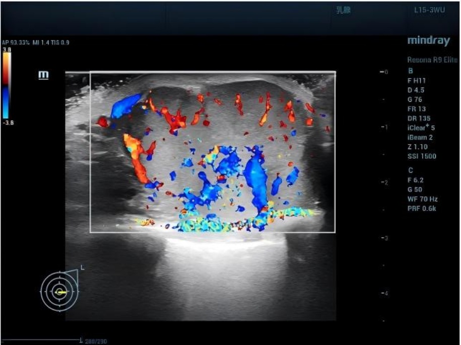 2025年5月19日入院后,完善胎儿、心脏、泌尿系、肝胆胰脾、甲状腺及双下肢血管超声等检查。经乳腺外科、泌尿外科、肾内科、骨科、新生儿科及麻醉科多学科会诊(MDT),制定“先剖宫产终止妊娠,再针对性治疗乳腺肿瘤及肾积水”的诊疗方案。术前于5月20日、21日分次输注悬浮红细胞共2U以纠正贫血,并完成预防感染及血栓筛查。5月22日在腰硬联合麻醉下行子宫下段剖宫产 + 双侧输卵管结扎术,娩出一男婴(体重2700 g,Apgar评分9-10-10分),术中出血约200 ml。术后即刻由乳腺外科行左乳肿物穿刺活检。