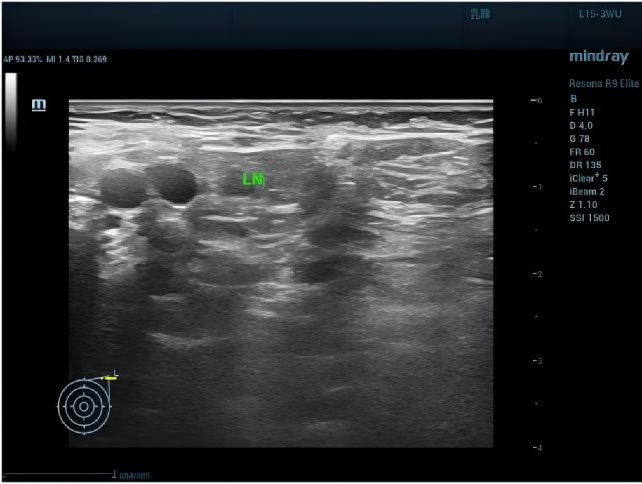 图1. (A) 左侧乳腺彩色多普勒超声提示:乳腺内局灶性病变区域血流信号丰富;(B) 左侧腋窝区灰阶超声示:可见类圆形淋巴结(LN),边界清晰,皮髓质分界欠清