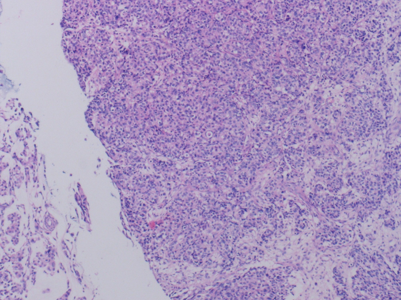Figure 3. Hematoxylin and eosin (H&E) staining of the breast biopsy showing infiltrative growth of atypical cells, consistent with invasive breast carcinoma