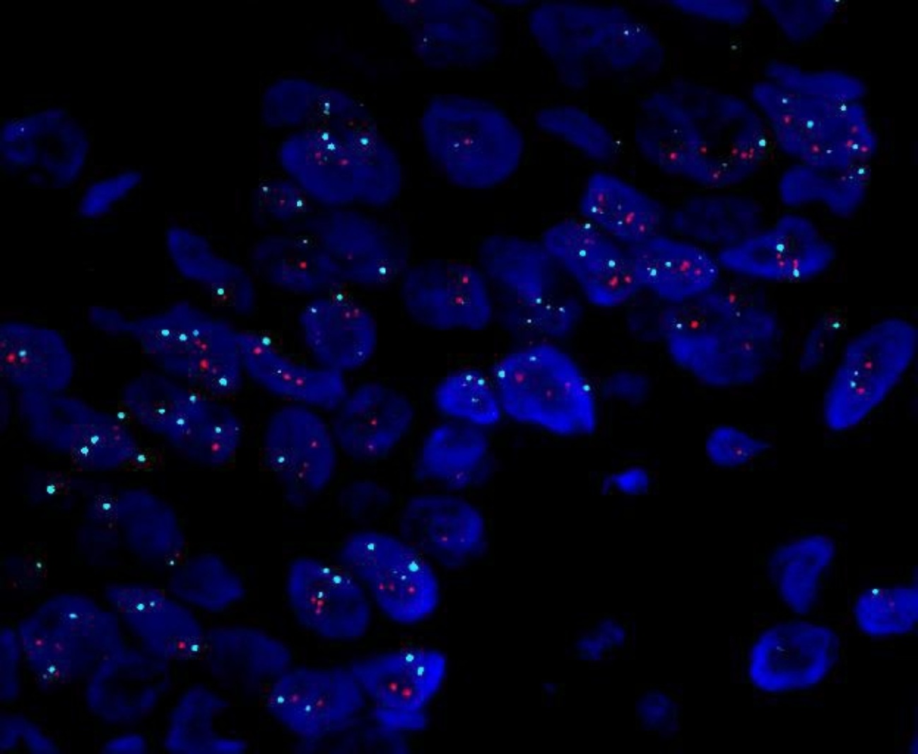 Figure 4. FISH testing showing no amplification of the HER2 gene
