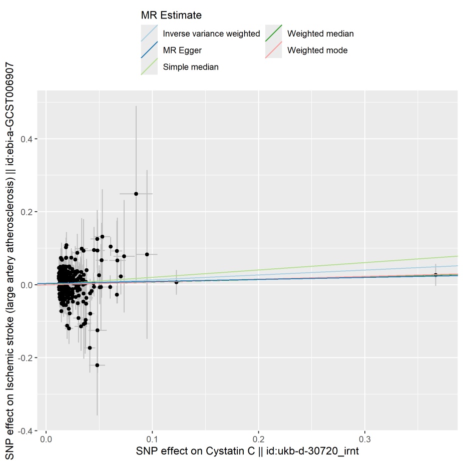 本研究应用双样本孟德尔随机化分析进一步探讨了胱抑素C、谷氨酰转肽酶水平、载脂蛋白A与LAA之间的潜在因果关系。在单变量分析中,IVW分析发现胱抑素C、谷氨酰转肽酶水平升高与LAA风险显