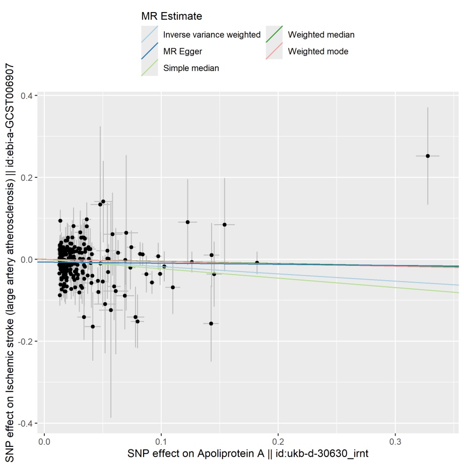 本研究采用逆方差加权(Inversevariance Weighted, IVW)方法作为估计因果效应的主要方法。为了确保研究发现的稳健性,进行了补充分析,简单中位数法(Simple Median, SM)、加权模式法(Weighted Mode, WM)、加权中位数法(Weighted Median, WME)及MR-Egger回归(MR-Egger Regression)。此外,我们执行了一系列敏感性分析来进一步验证结果。为了检测可能偏倚MR结果的水平多效性,进行了MR-Egger截距检验。此外,还使用了MR-PRESSO离群值检测方法来识别并纠正SNPs中的离群值,从而解决任何潜在的水平多效性。应用Cochran Q检验来评估异质性,这可能影响因果估计。如果P > 0.05,表明异质性对因果关系的影响可以忽略。为进一步评估载脂蛋白A是否具有独立于血脂水平的保护作用,我们进行了多变量孟德尔随机化(MVMR)分析,将载脂蛋白A与高密度脂蛋白胆固醇(Genome-Wide Association Study ID: ieu-a-299)和低密度脂蛋白胆固醇(Genome-Wide Association Study ID: ieu-a-300)一起纳入模型作为协变量。通过选取与ApoA显著相关的SNP,并在三个暴露中提取同一批SNP的效应,再与LAAGWAS数据进行Harmonisation,实现MVMR分析,主分析采用多变量IVW方法,同时进行了MR-Egger敏感性分析,以检验潜在的多效性和稳健性。统计分析是在R软件(版本4.3.2)中进行的,使用“TwoSampleMR”和“MRPRESSO”包进行MR分析,并使用“forest plot”包进行可视化。P < 0.05为差异有统计学意义。